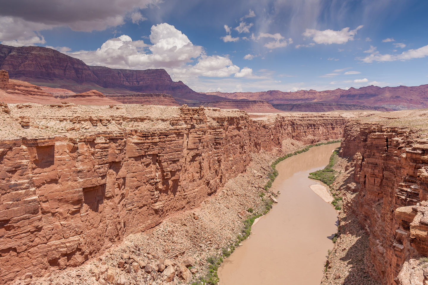 Kurz hinter dem neu asphaltierten Stück befindet sich ein Aussichtspunkt und wir halten dort für ein Picknick im Auto, während wir den Blick zurück auf den Südrand der Vermilion Cliffs und die hier noch schmale Schlucht des Colorado River genießen.