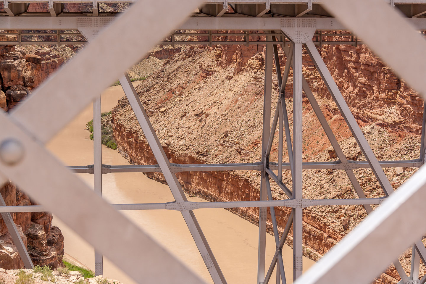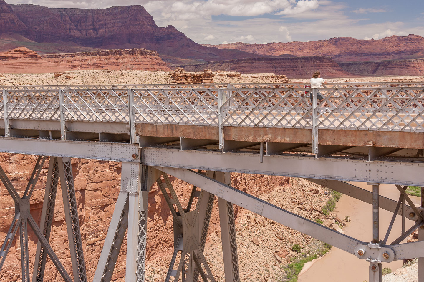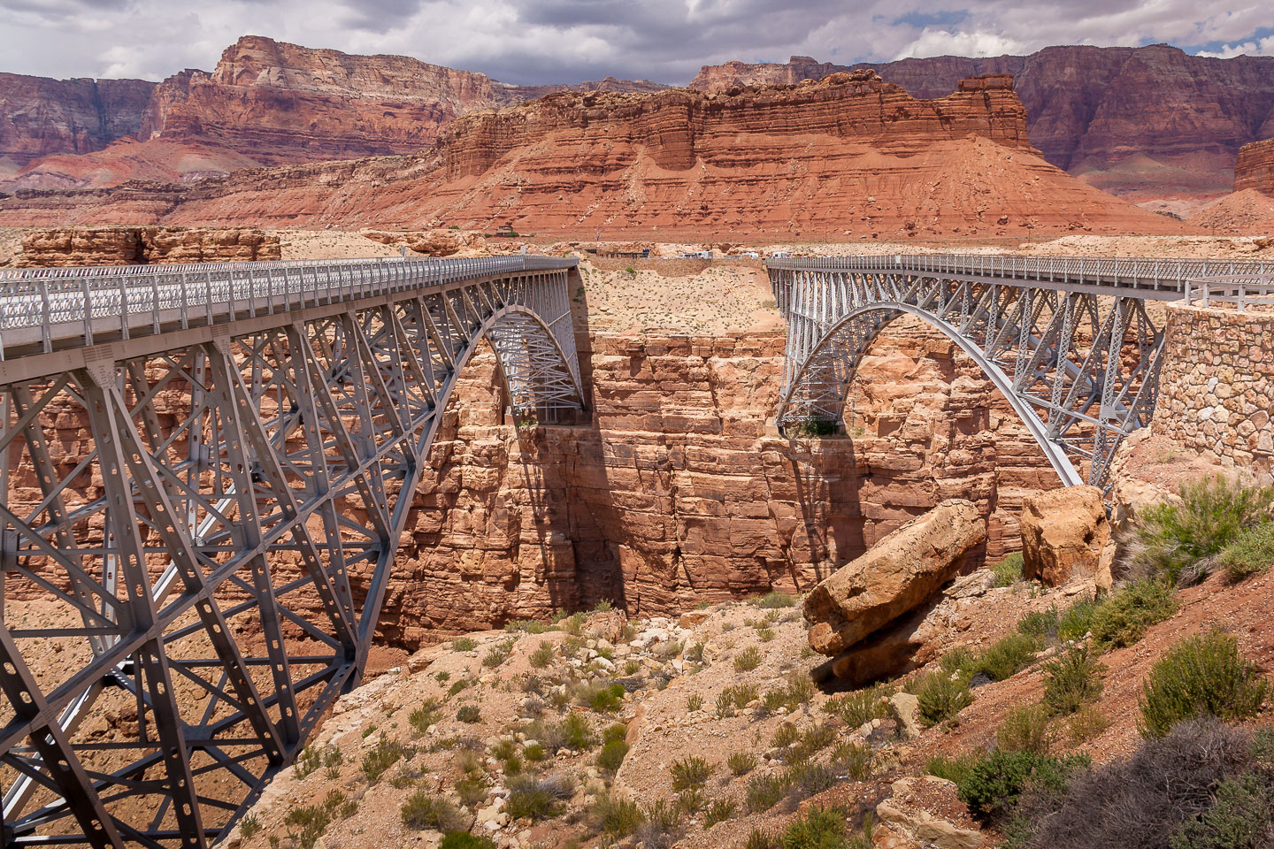 Danach fahren wir zurück auf die 89A und zur Navajo Bridge. Parallel zur befahrbaren Brücke befindet sich die historische Brücke, die für Fußgänger geöffnet ist. Aufziehende Gewitterwolken sorgen für dramatische Fotomotive. Wir fahren weiter nach Bitter Springs und dort auf die 89 Richtung Page.