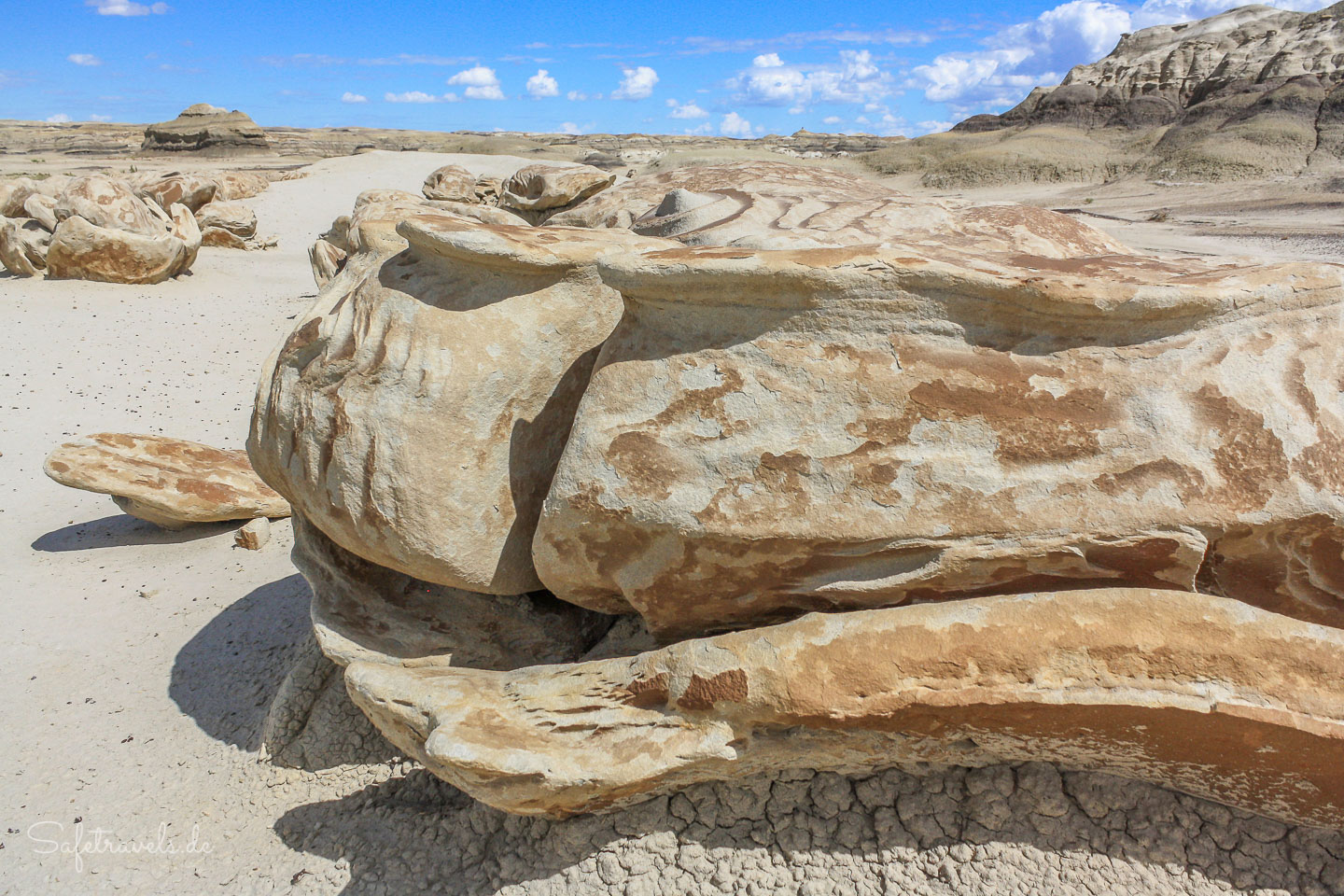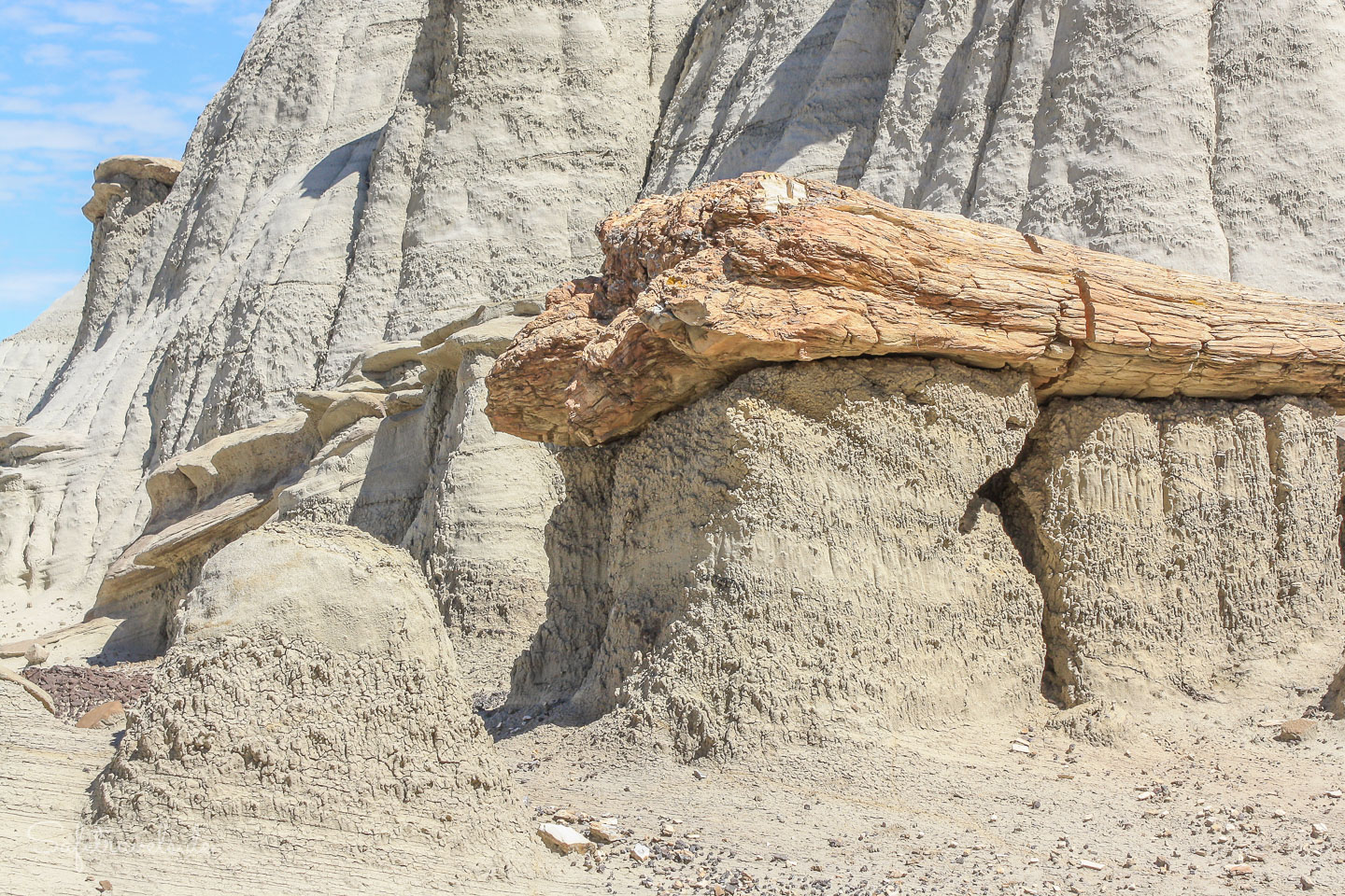 Kurz darauf treffen wir den Fotografen Jim, der mit einer Kundin auf Fototour ist. Jim nimmt uns ein Stück mit und zeigt uns interessante Formationen und versteinerte Baumstämme. Die Strukturen erinnern teilweise an die Hoodoos im Bryce Canyon, allerdings überwiegen hier die Farben grau und braun.
