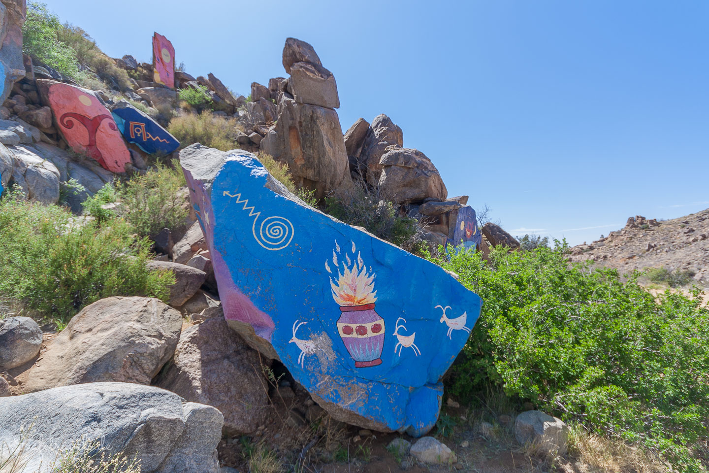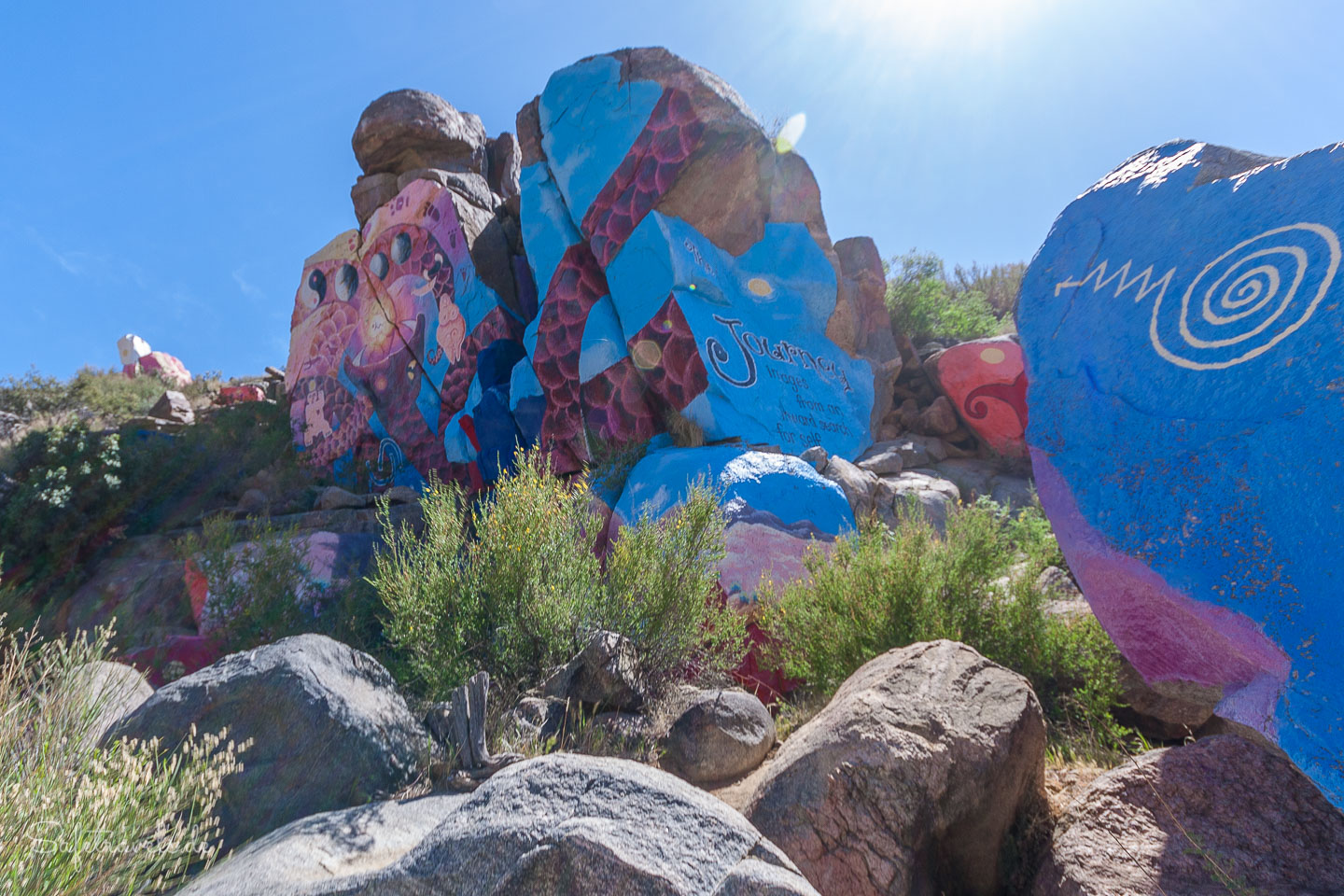 1966 nahm sich der Maler Roy Purcell eine Auszeit vom Kunststudium in Salt Lake City und arbeitete in den Minen bei Chloride. Ganz nebenbei entstanden so imposante Malereien auf den Granitfelsen der Cerbat Mountains, die Chloride Murals. „The Journey“, eine Serie von leuchtend bunten Bildern, symbolisiert den Beginn eines neuen Weges in Purcells Leben: