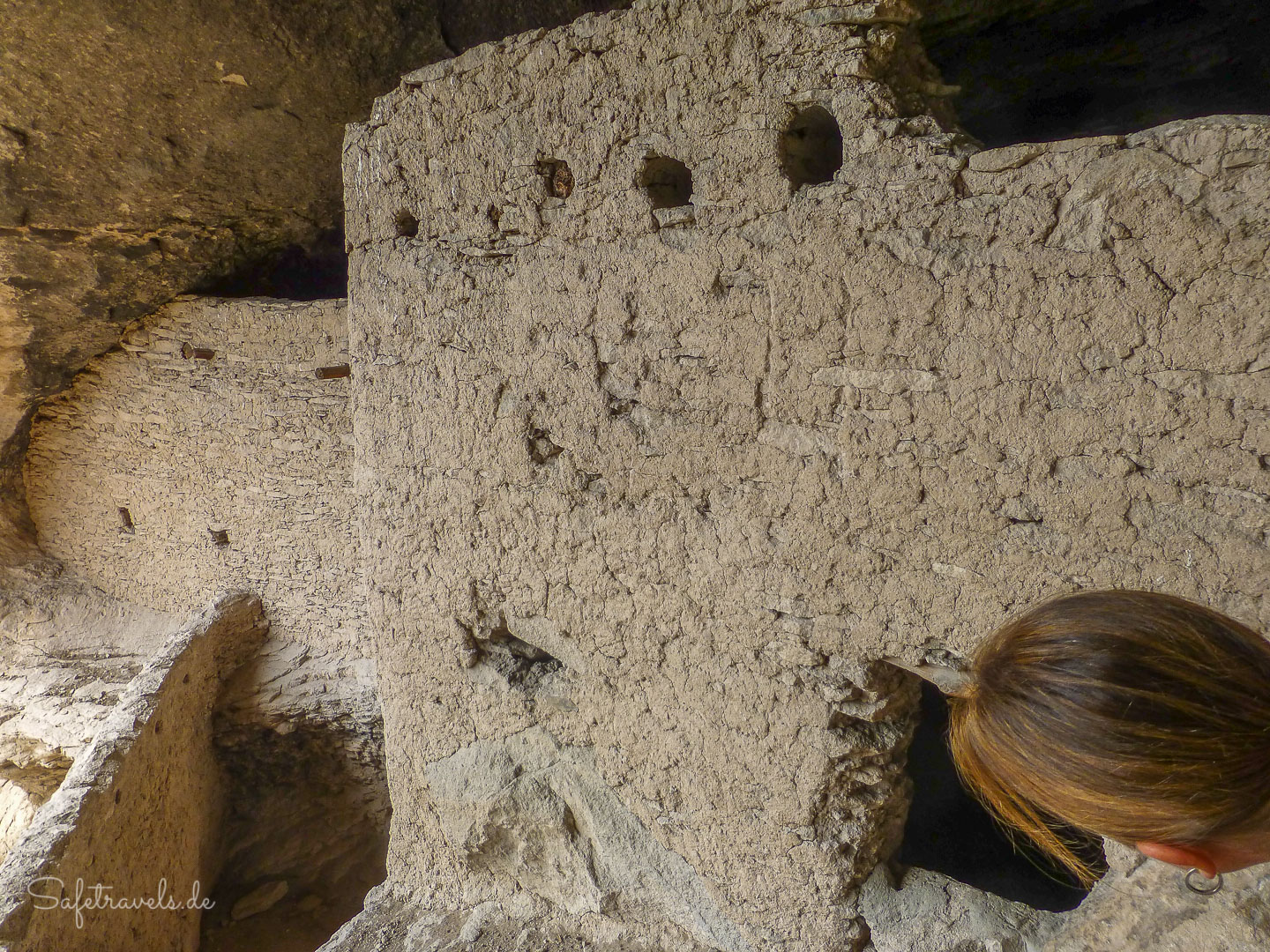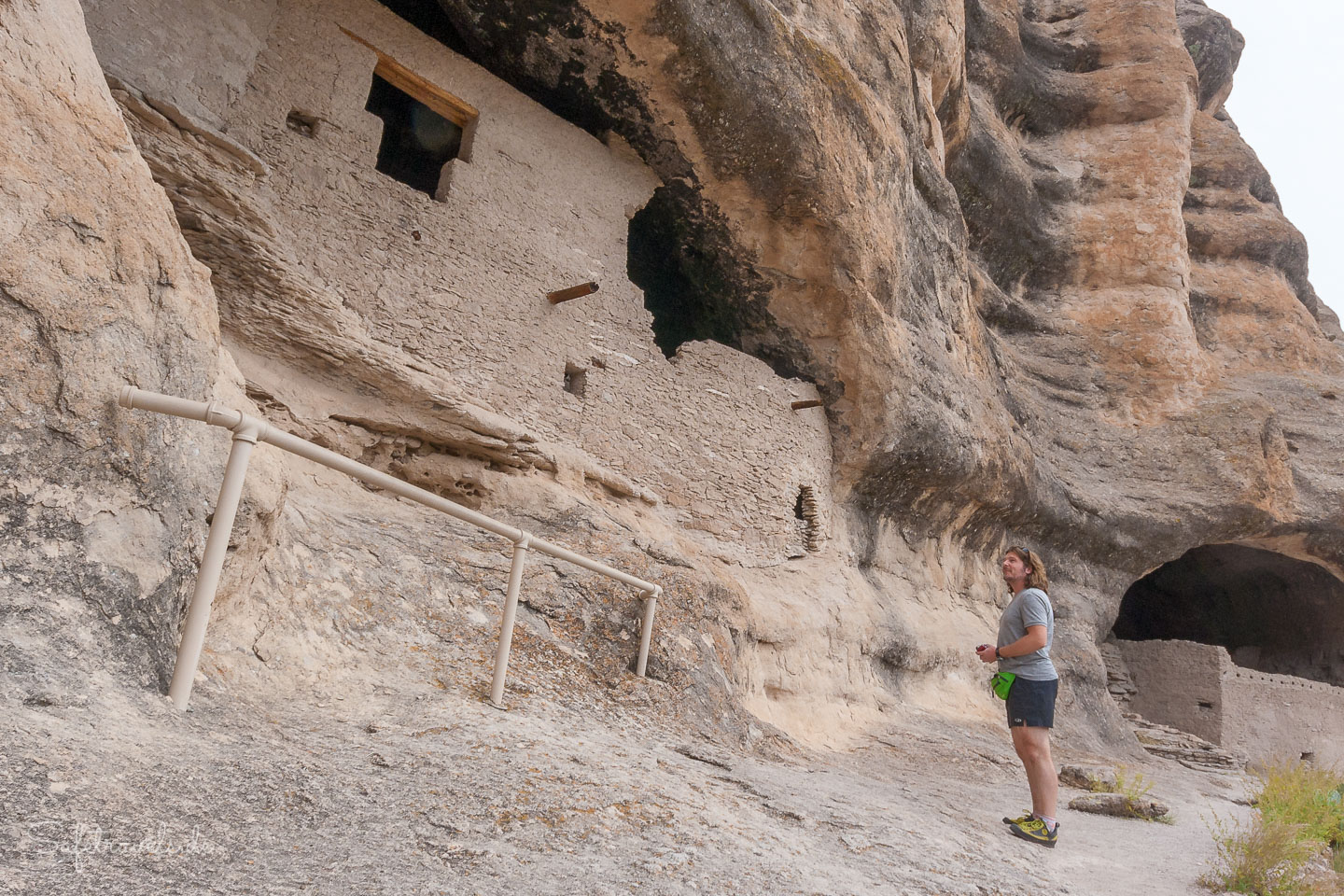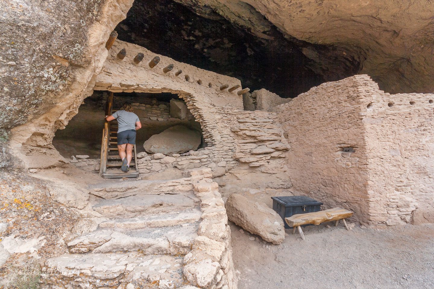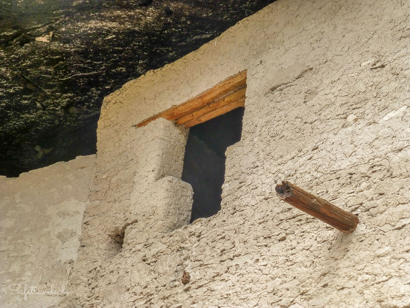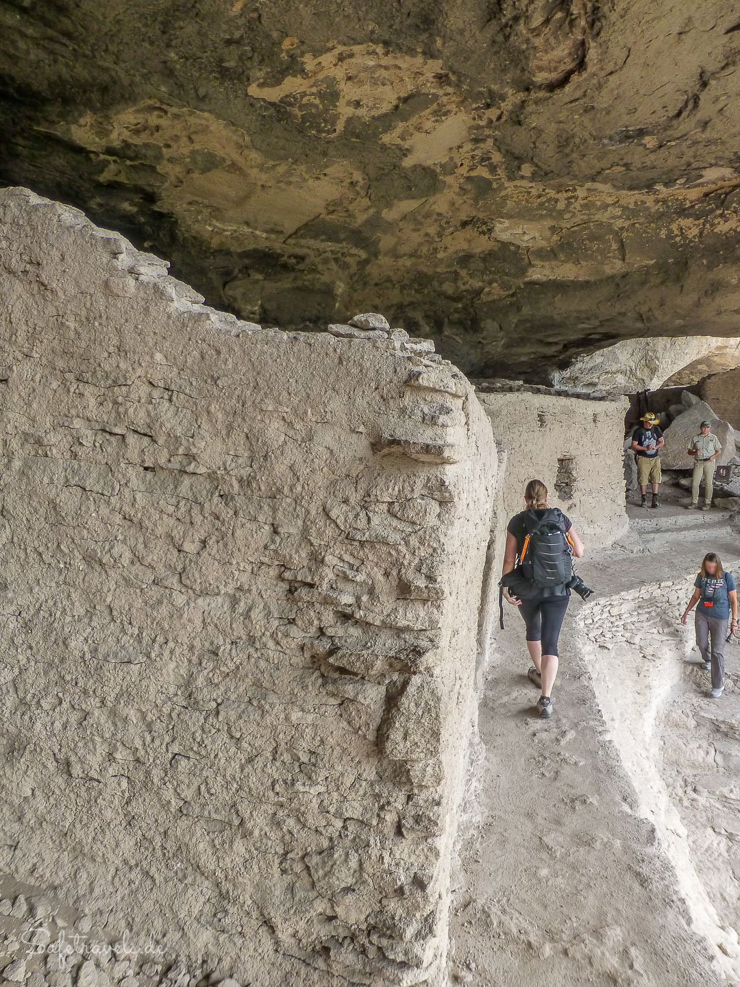 Die Ruinen können betreten werden und eine Rangerin erzählt ein bißchen was zur Geschichte. Außer uns befinden sich zur selben Zeit etwa noch 5 andere Besucher innerhalb der Gila Cliff Dwellings. Es ist ein sehr hautnahes Erlebnis mit der Geschichte der hiesigen Pueblo-Kultur. Dafür hat sich die lange Anfahrt definitiv gelohnt. Wir nehmen uns ausgiebig Zeit zum Bestaunen und Fotografieren der Cliff Dwellings, bevor wir wieder in den Canyon hinabsteigen. Der Trail selbst ist insgesamt etwa eine Meile lang. Ach ja, natürlich macht Markus wieder Ar…-Fotos von mir, wie üblich.