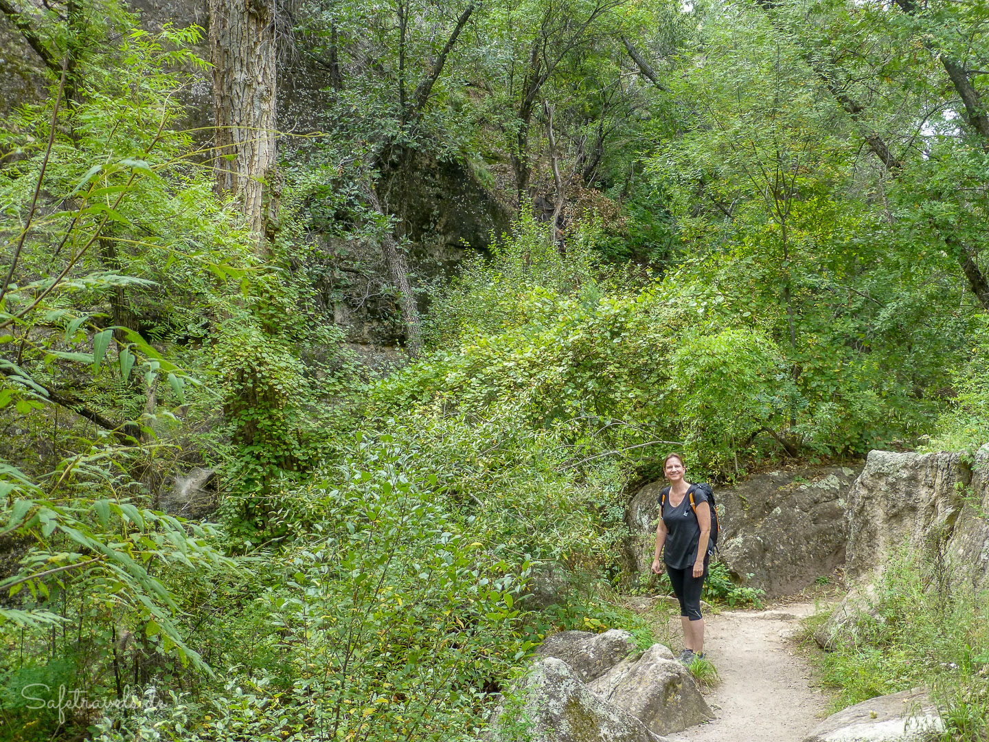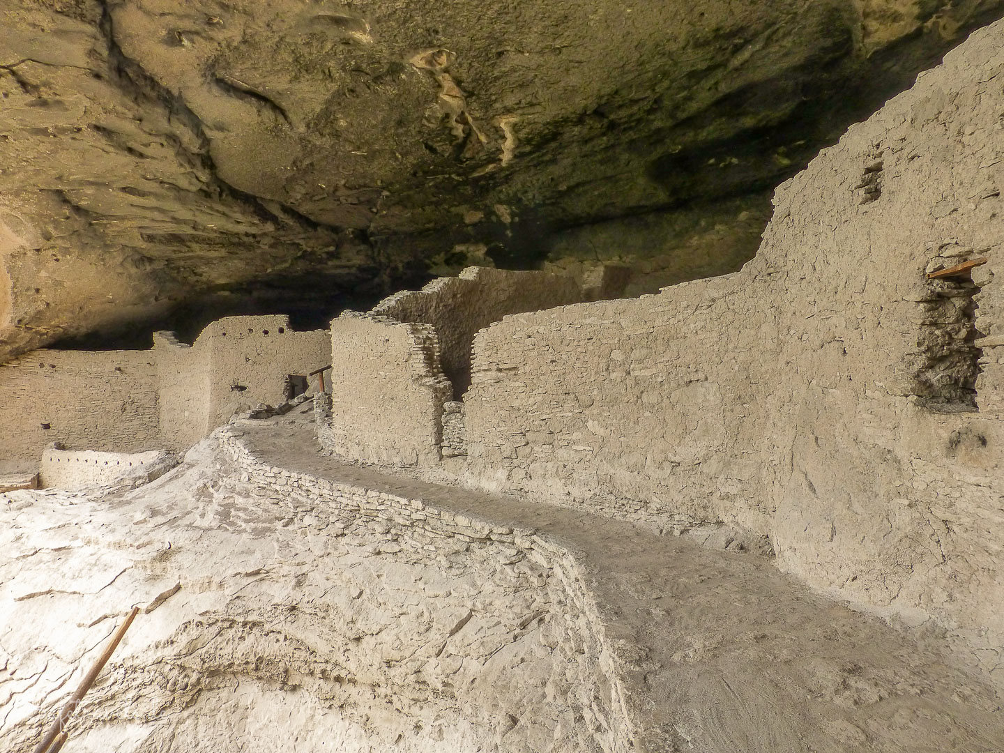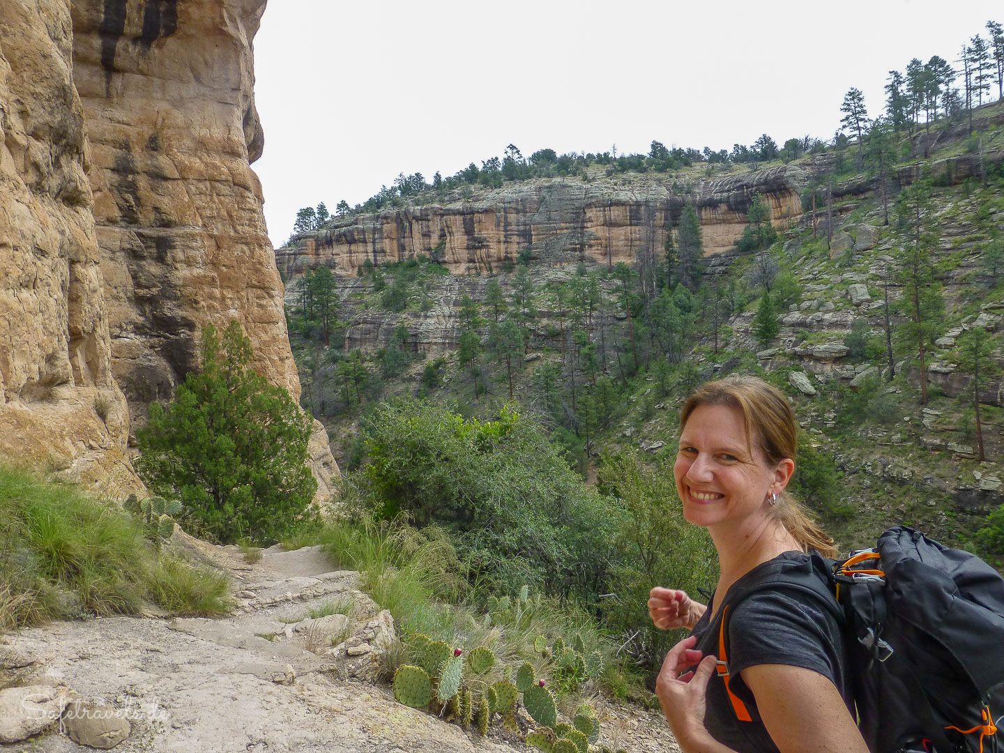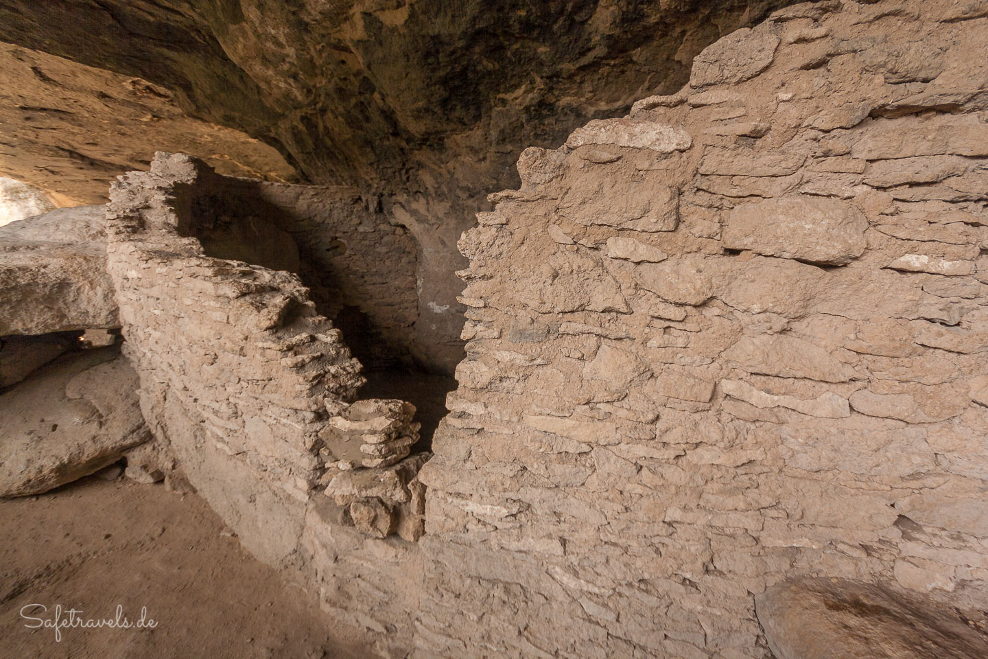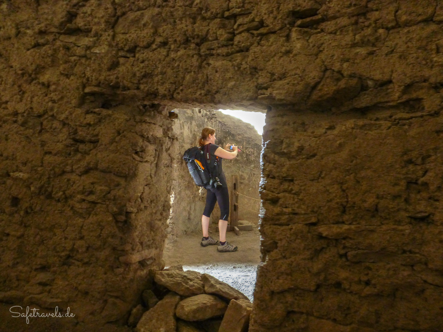Die Ruinen können betreten werden und eine Rangerin erzählt ein bißchen was zur Geschichte. Außer uns befinden sich zur selben Zeit etwa noch 5 andere Besucher innerhalb der Gila Cliff Dwellings. Es ist ein sehr hautnahes Erlebnis mit der Geschichte der hiesigen Pueblo-Kultur. Dafür hat sich die lange Anfahrt definitiv gelohnt. Wir nehmen uns ausgiebig Zeit zum Bestaunen und Fotografieren der Cliff Dwellings, bevor wir wieder in den Canyon hinabsteigen. Der Trail selbst ist insgesamt etwa eine Meile lang. Ach ja, natürlich macht Markus wieder Ar…-Fotos von mir, wie üblich.