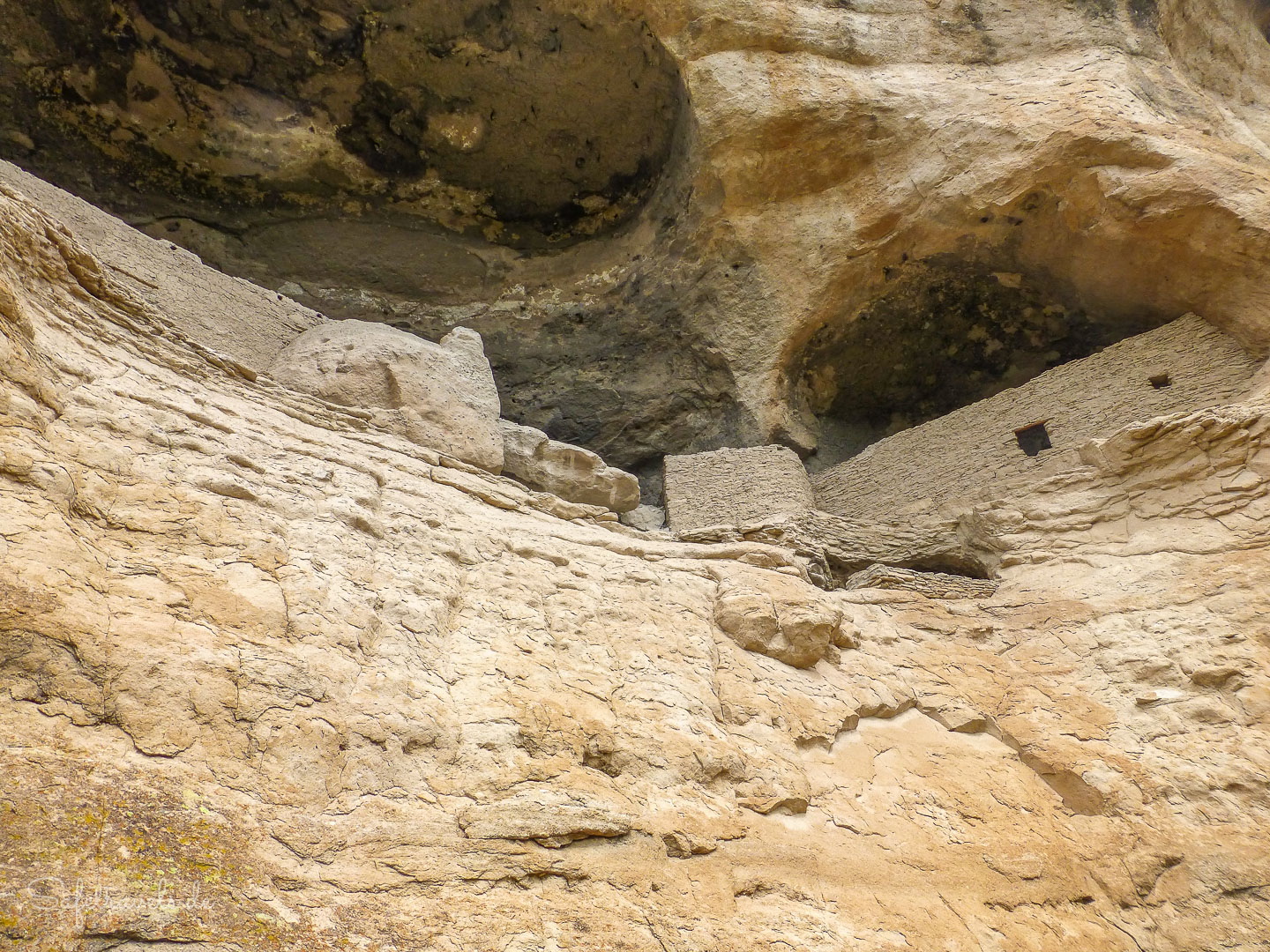 Der Trail führt in den bewaldeten vulkanischen Canyon und hier und da gibt der Wald den Blick auf die Cliff Dwellings hoch oben in der Canyonwand frei. 60 Meter müssen wir hochsteigen, bis wir direkt vor den Höhlen stehen. Die Cliff Dwellings bestehen aus etwa 40 Räumen, die sich über 5 natürliche Höhlen in der Canyonwand verteilen.
