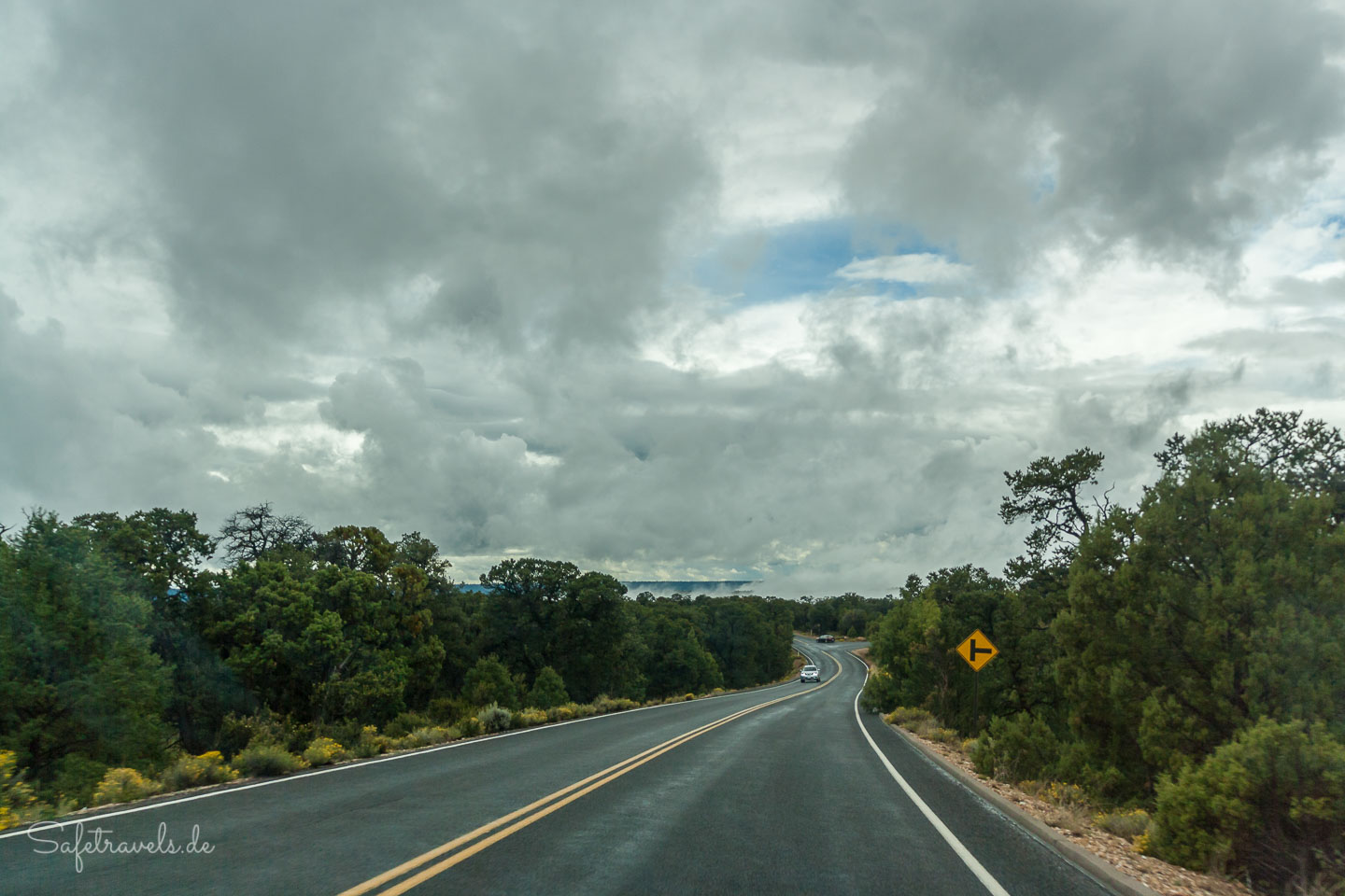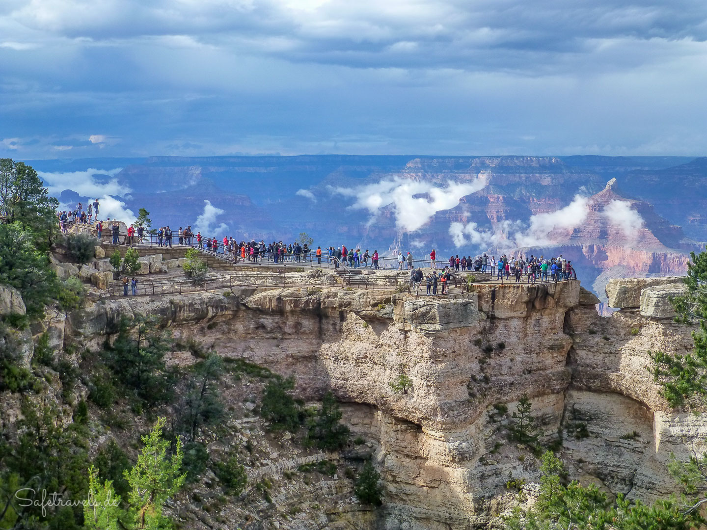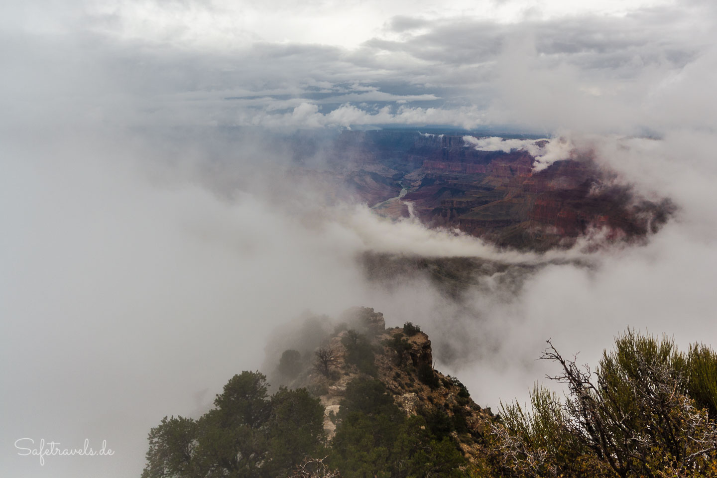 Vom Canyon de Chelly kommend, den wir bei bestem Regenwetter heute Morgen verlassen haben, empfängt uns der Grand Canyon am Desert View mit einem Wetter, welches die meisten Touristen hier zutiefst verärgert. Nebelbänke und besonders tiefliegende Wolken bedecken den größten Teil der Schlucht und nur ab und zu erlaubt ein Loch in den Wolken einen Blick in den Abgrund.
