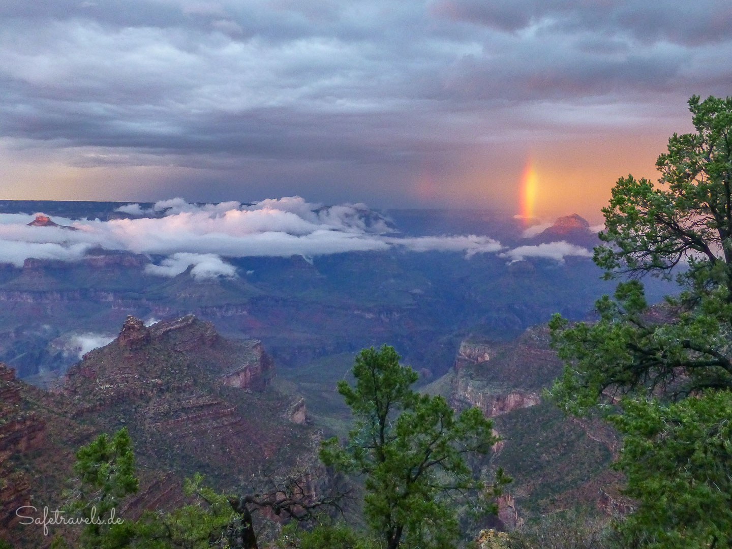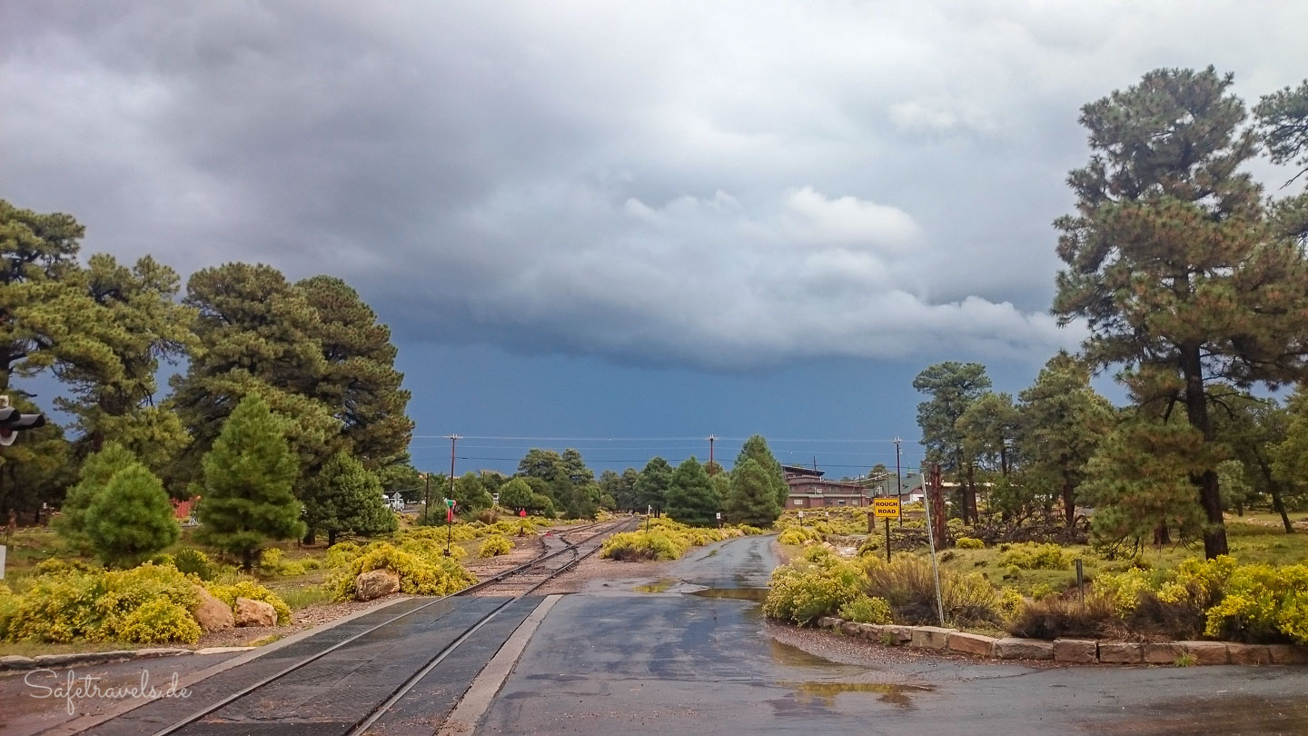 Nachdem der Regen aufgehört hat, gehen wir die 5 Minuten zu Fuß zum Rim und genießen die Luft direkt nach dem Gewitter. Zum Abschluss des Tages schenkt uns der Grand Canyon noch einen Regenbogen.