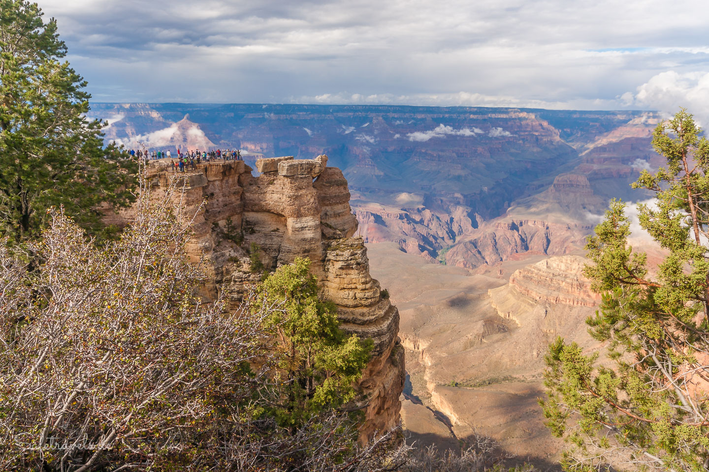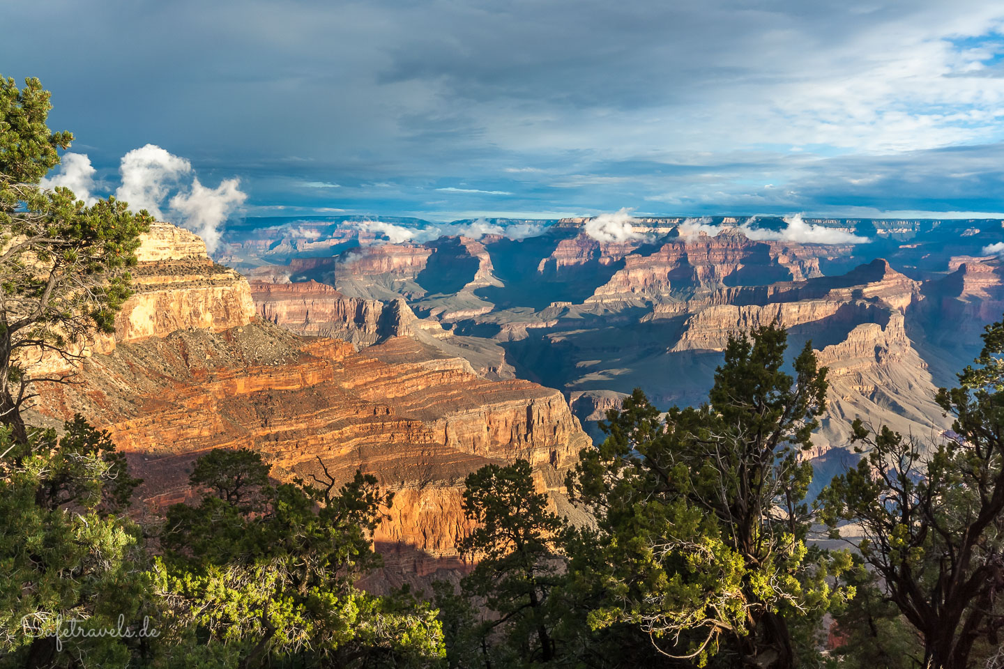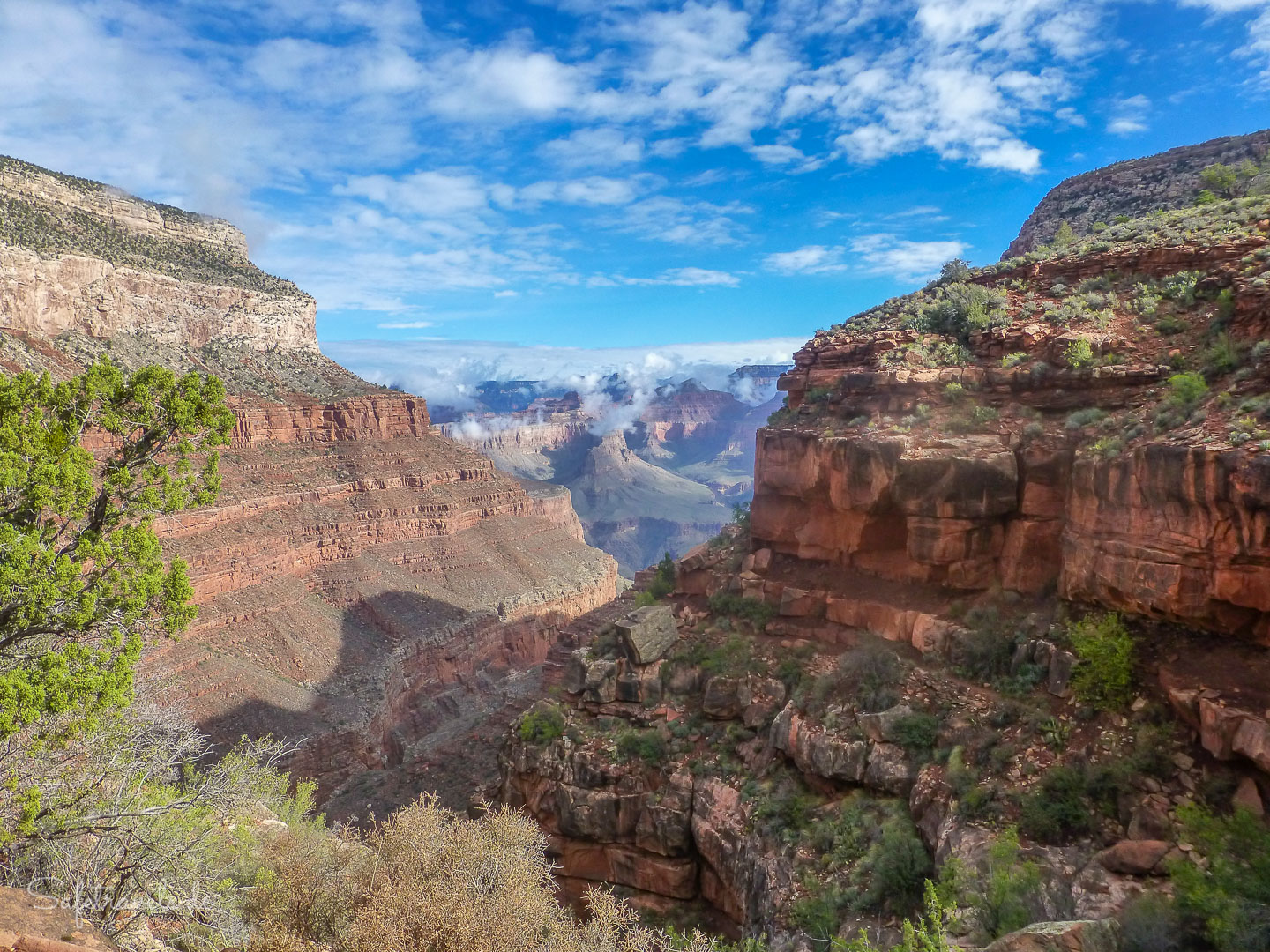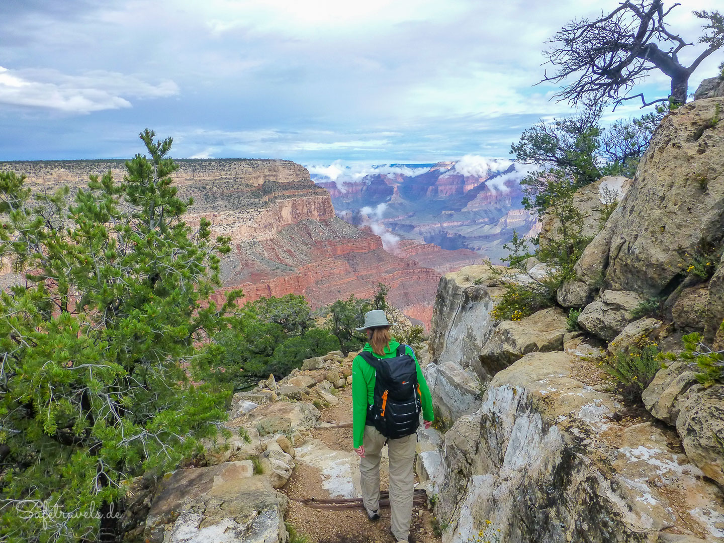 Nach einem kurzen Frühstück auf dem Zimmer nehmen wir gegen 7 Uhr den Shuttlebus Richtung Hermits Rest. Die Luft ist klar und über der Schlucht hängen noch Wolken. Traumhaftes Wander- und Fotowetter.