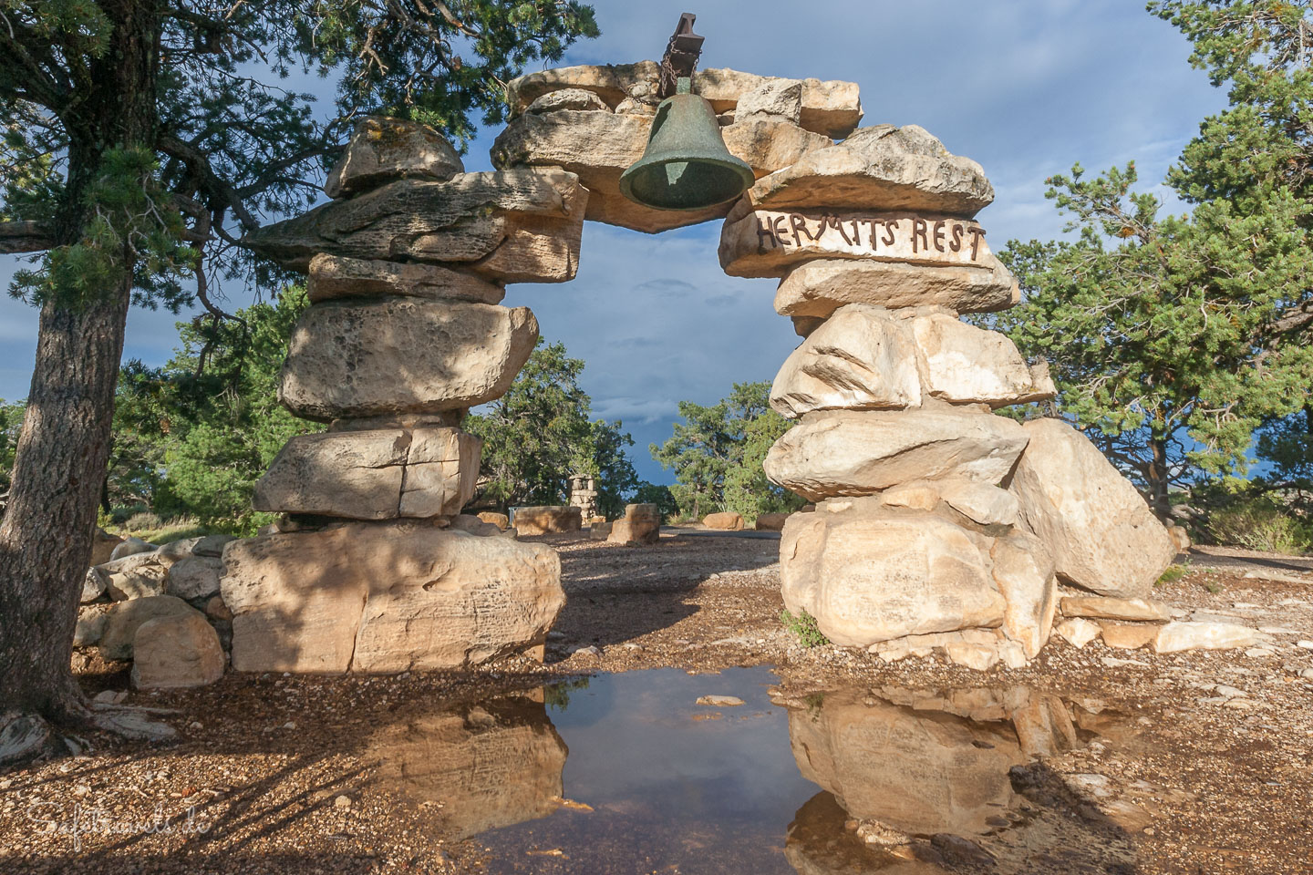 Bei Hermits Rest sind wir so früh morgens fast allein. Shop und Snacktheke sind sowieso noch geschlossen. Beide befinden sich in einem historischen Gebäude von 1914, welches ebenso wie der Desert View Watchtower von Mary Jane Colter entworfen wurde. Die meisten Touristen kommen mit dem Bus hierher, schauen einmal in den Canyon, kaufen ein Souvenir und einen Becher Kaffee und haken den Grand Canyon auf ihrer Liste ab.