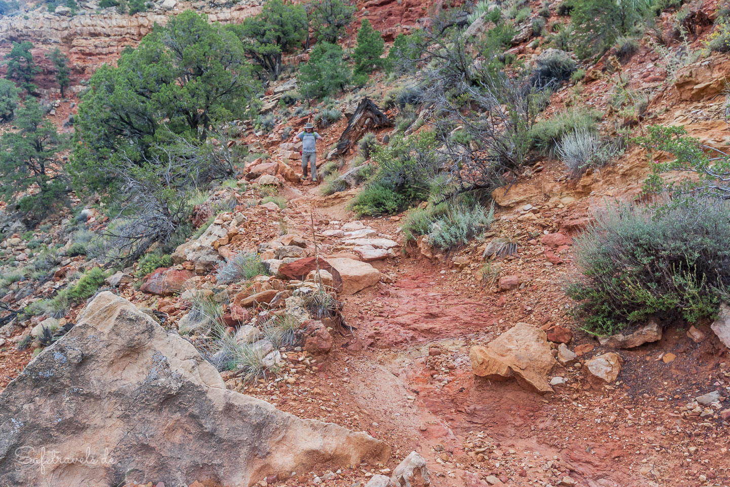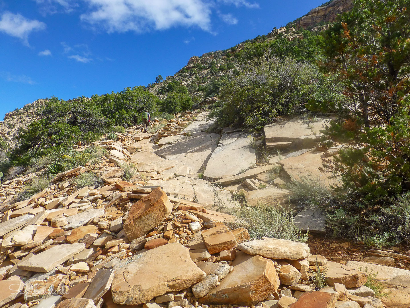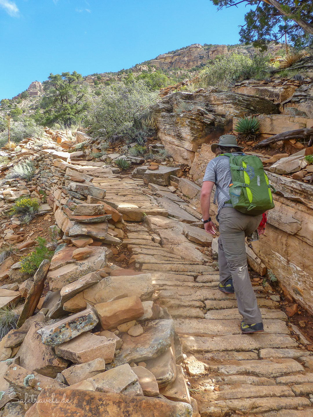 Auf dem oberen Teil führt der Trail über Switchbacks steil durch den Kaibab und Coconino Sandstein. Teilweise ist noch das historische Pflaster aus senkrechten Steinplatten vorhanden, welches ursprünglich den Trail bedeckte. Hier und da ist Trail sehr steil und geröllig. Hier muss mehr gekraxelt als gewandert werden. Und stellenweise ist kaum ein Trail zu erkennen. Einmal verfehlen wir knapp den Trail und müssen ein Stück zurück gehen.