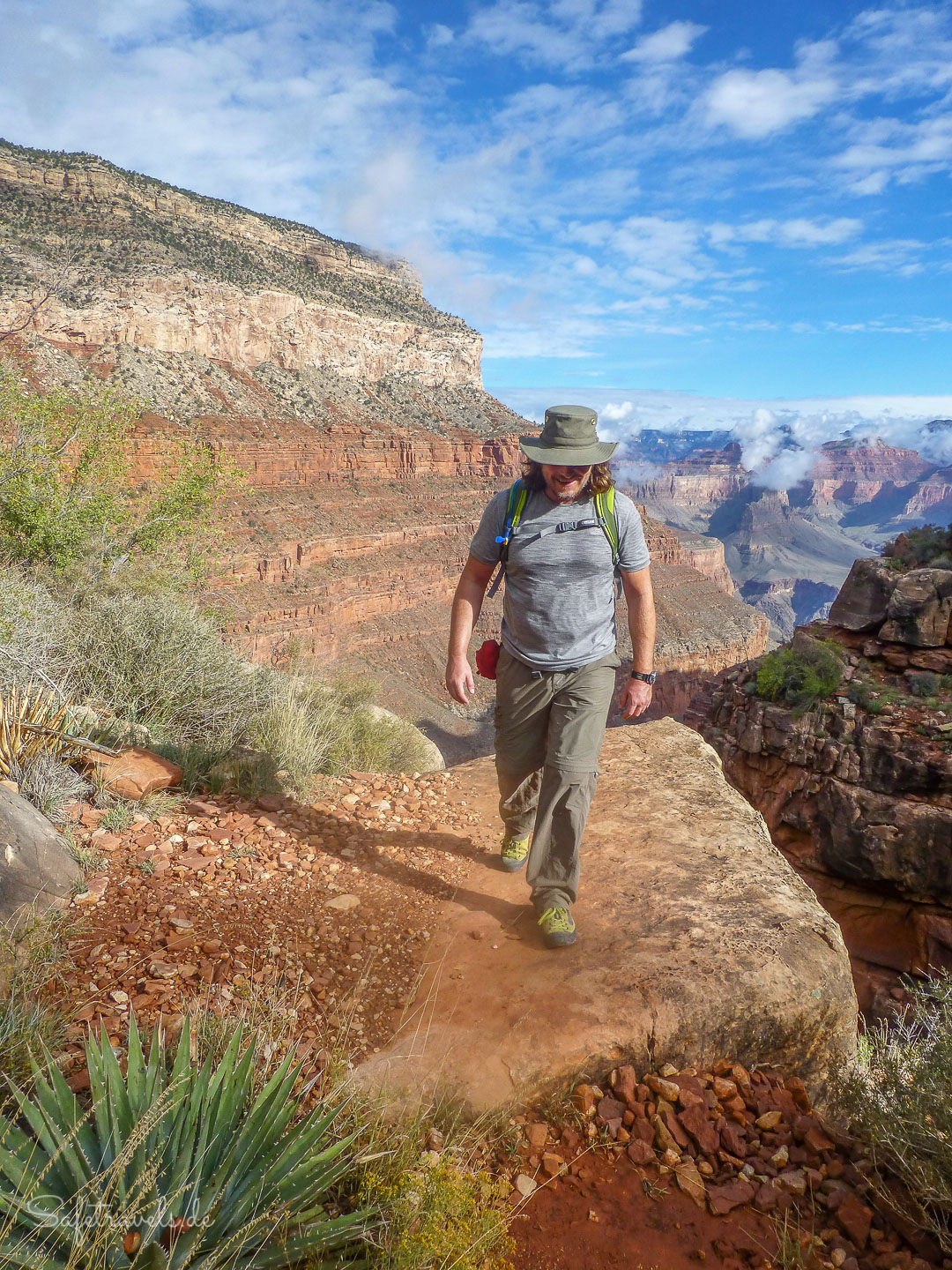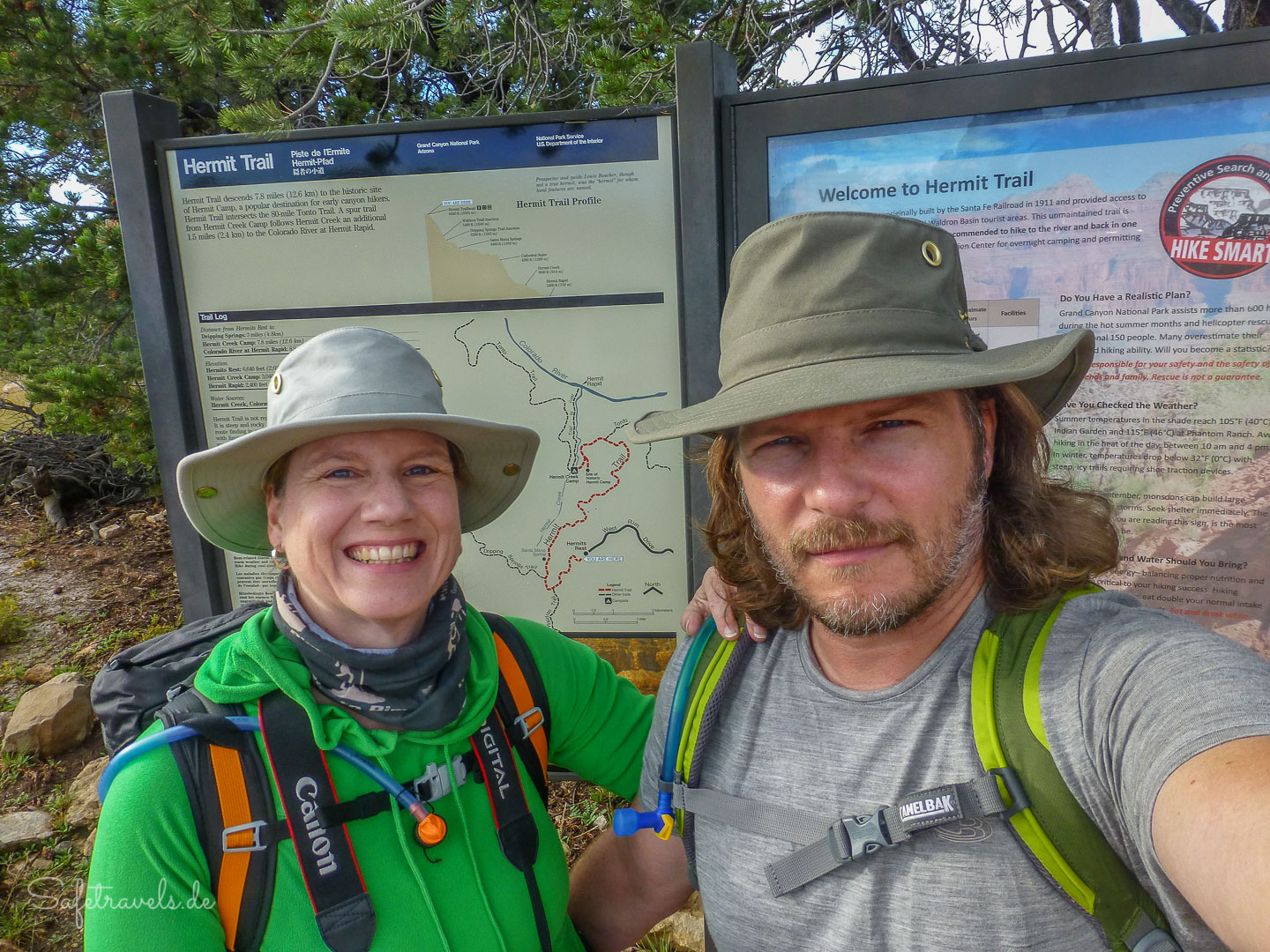 Der Trailhead liegt 400 m hinter Hermits Rest. Ganz in der Nähe befinden sich auch ein paar Picknicktische mit traumhaft schöner Aussicht. Um 8 Uhr starten wir am Trailhead, natürlich nicht ohne das typisch dämliche Starter-Selfie.
