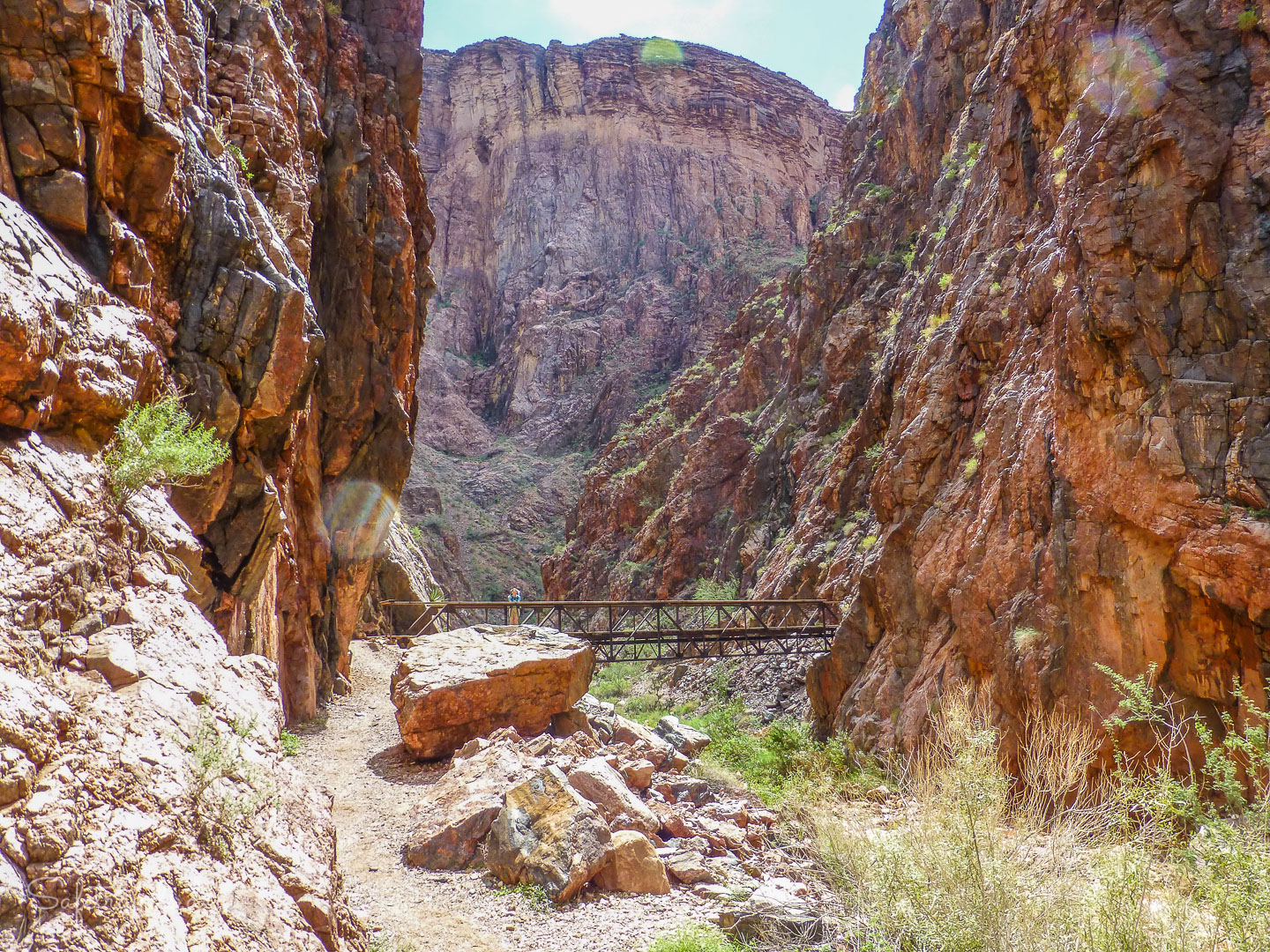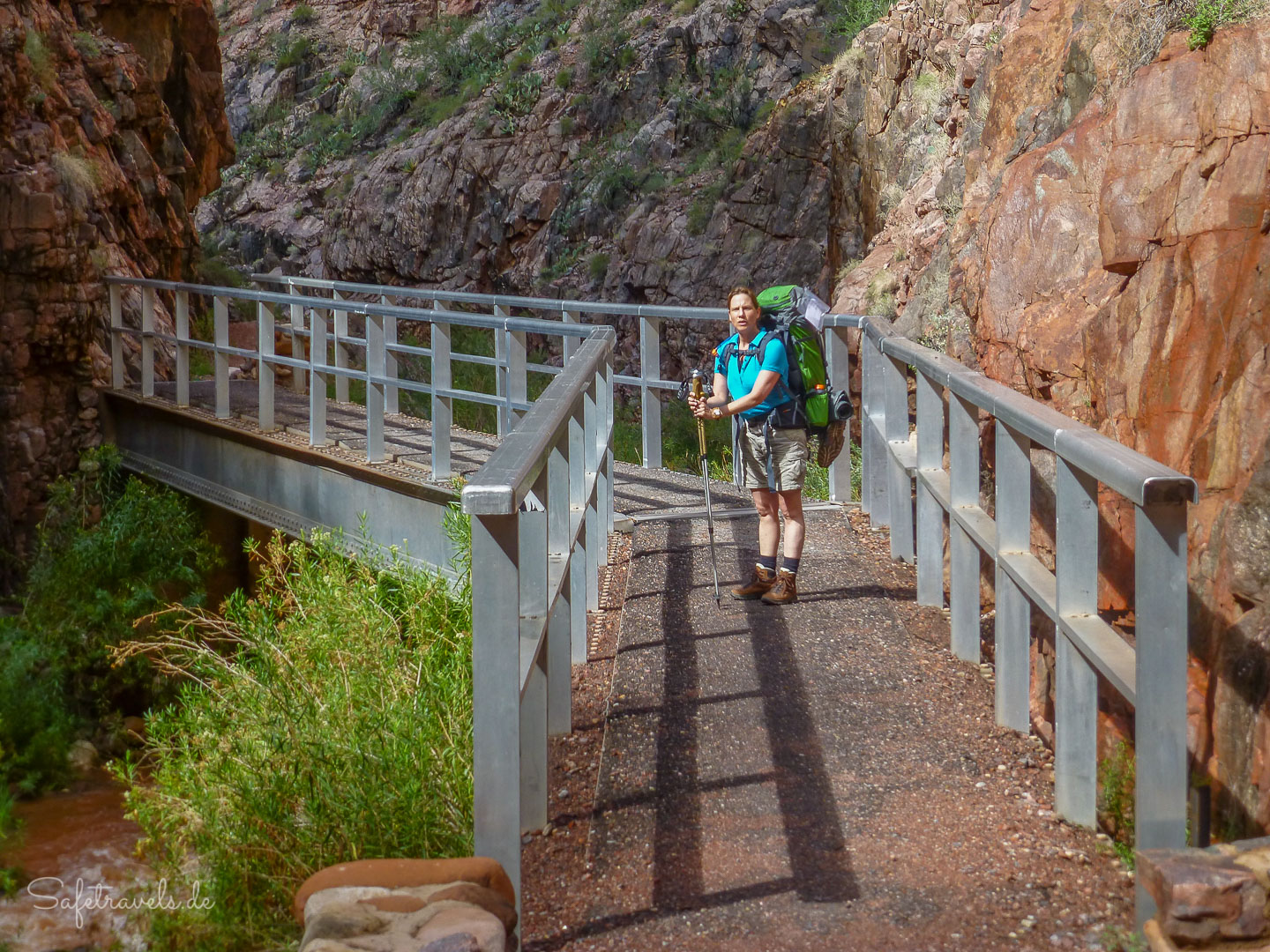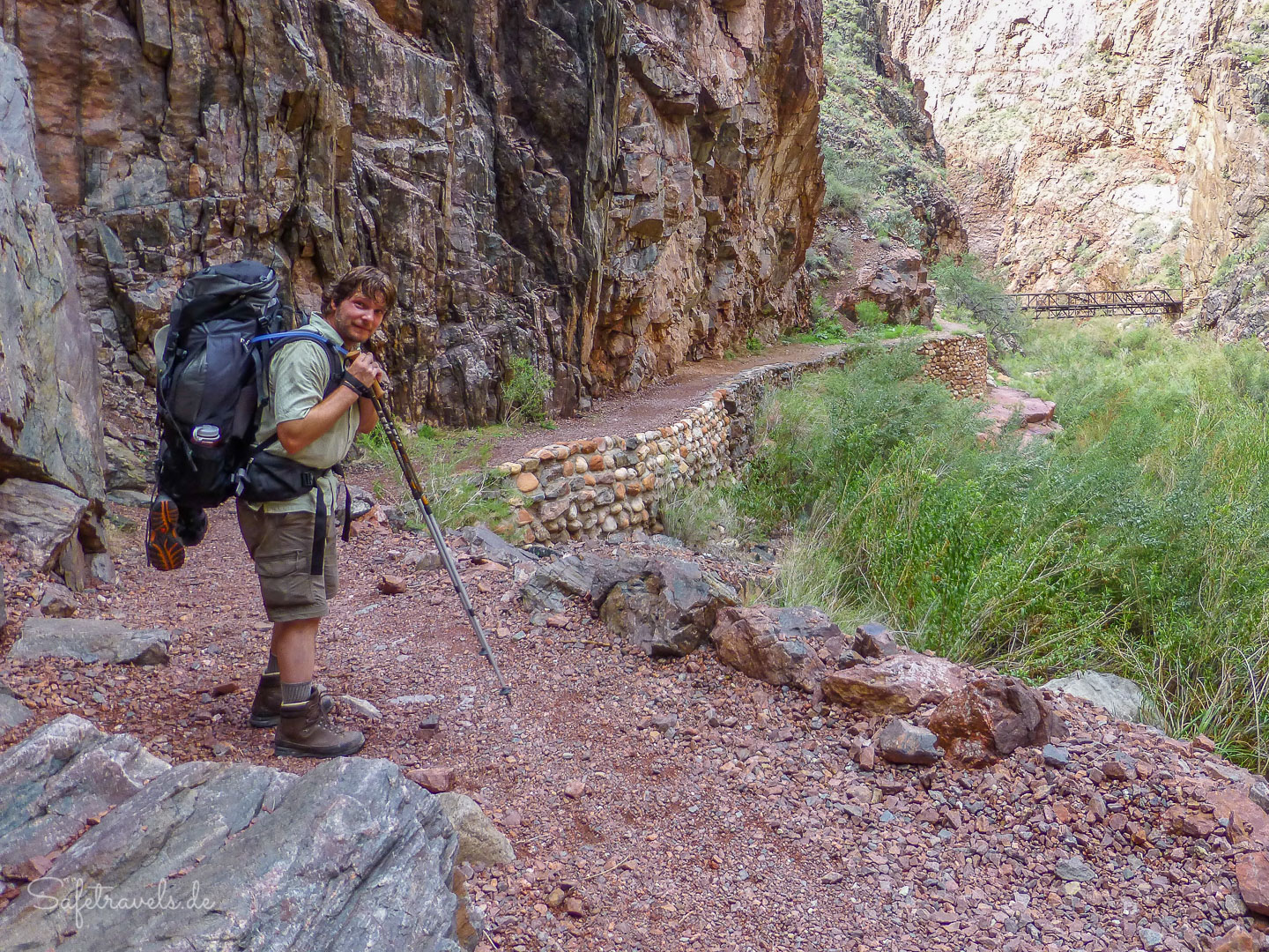 Hinter dem Tunnel eröffnet sich der Blick auf den Trail, der sich zunächst in weiteren Switchbacks hinunter zur Red Wall Bridge schlängelt. Hier befindet sich auch das zerstörte Stück des Trails, von dem wir gestern Bilder gesehen hatten. Der Trail ist über ein Stück von etwa einem Meter nur noch rund 30 cm breit. Zudem muss auch noch eine kleine Felsnase umgangen werden. Die Stelle ist etwas heikel, dennoch kommen wir gut vorbei und müssen nicht einmal die Rucksäcke abnehmen. Ich hatte echt Glück, daß meine Höhenangst nicht wirklich durchkam, sonst hätte ich schön weiche Knie hier bekommen. Entspannt steigen wir bis zur Brücke ab.