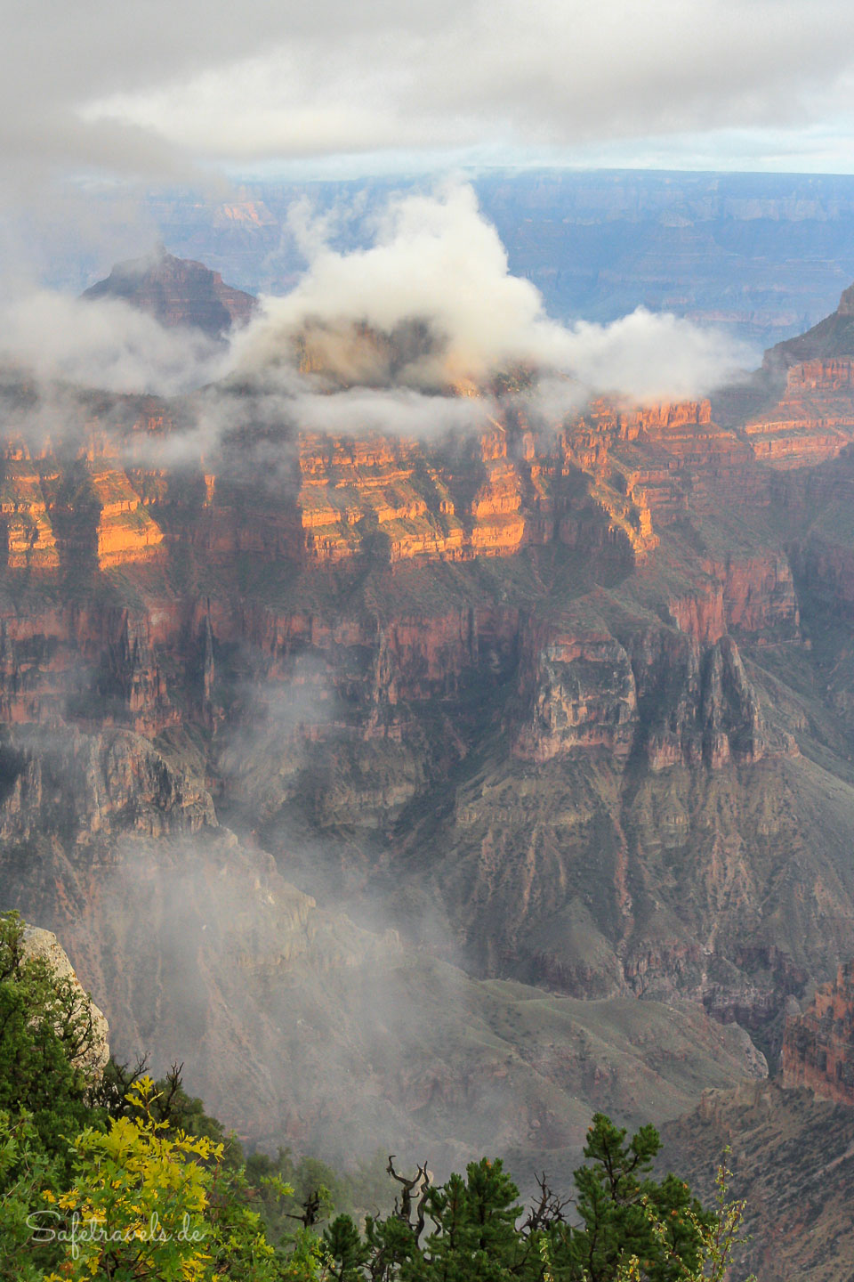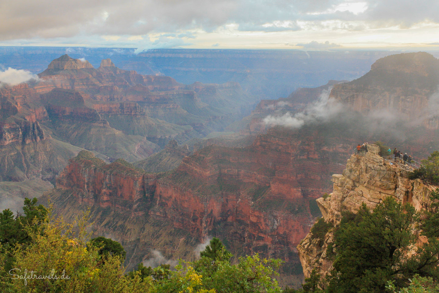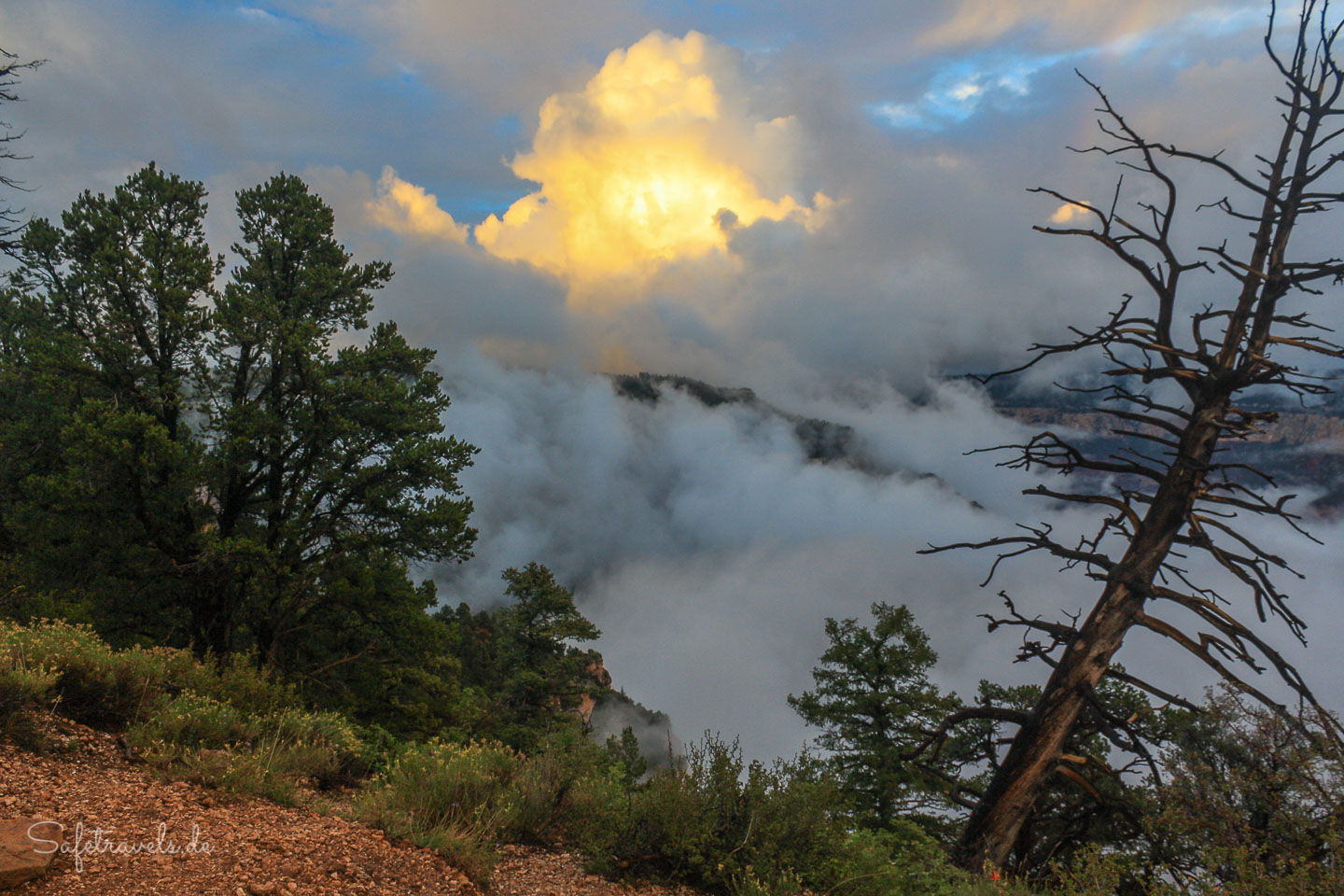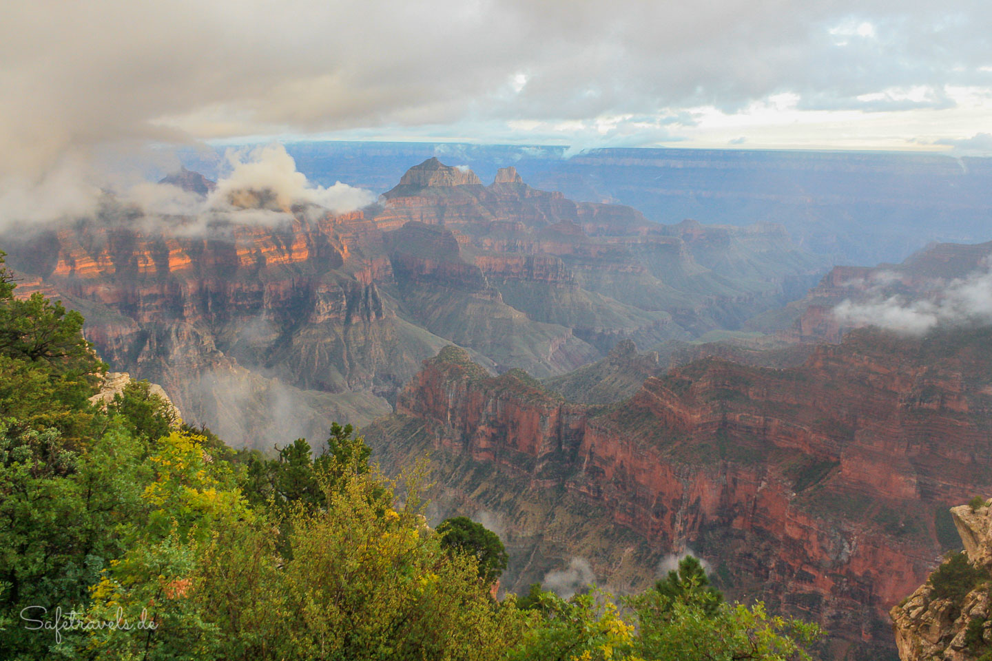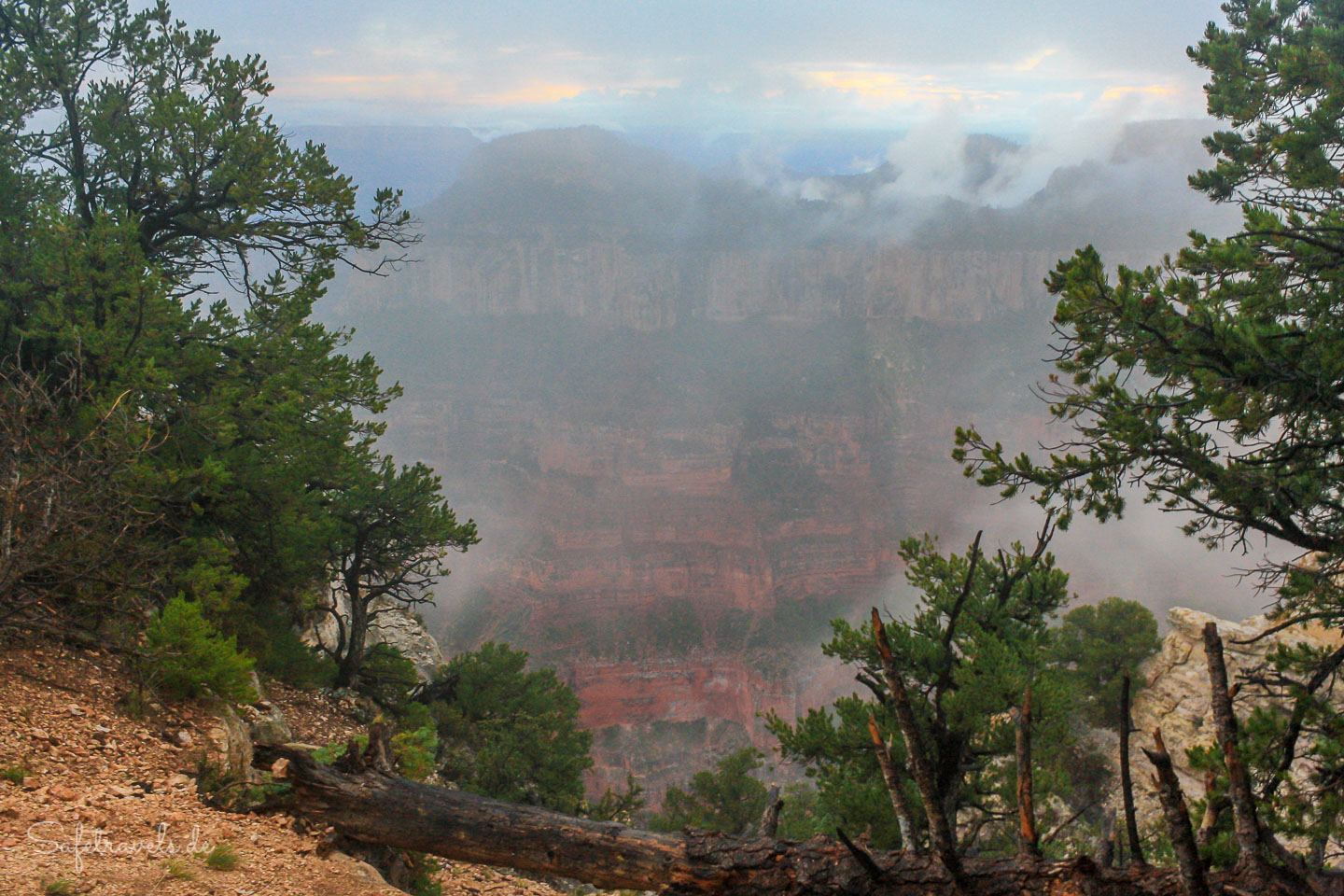 Der North Rim des Grand Canyon empfängt uns mit tiefliegenden Wolken und Regenwetter.