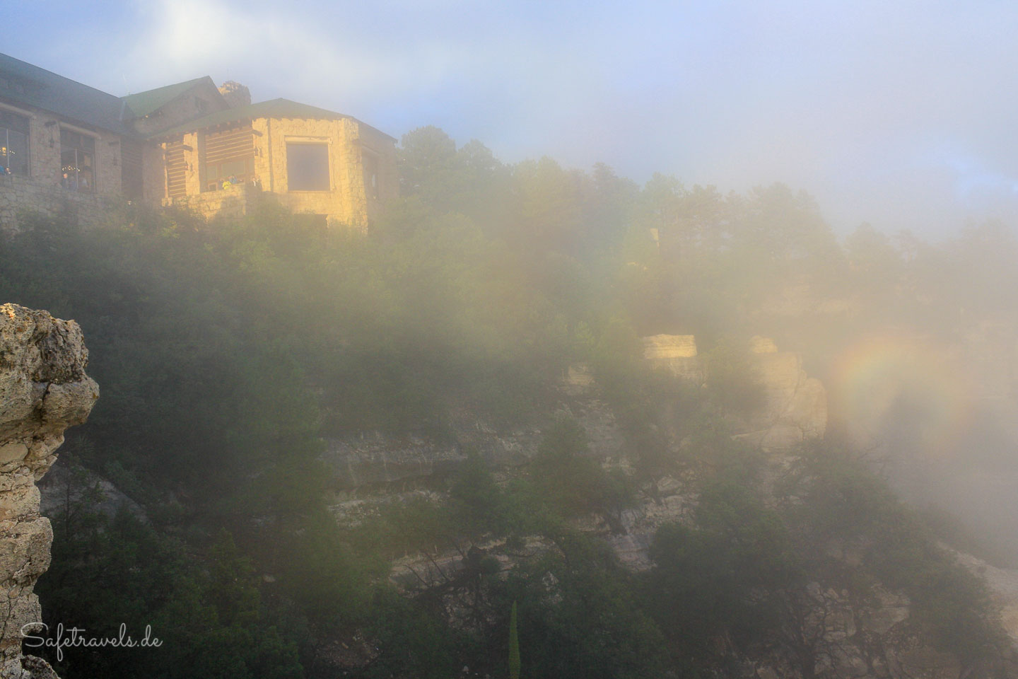 Nachdem wir fertig sind, schauen wir uns noch in Ruhe das wunderschön rustikale Hauptgebäude der Lodge an, und versuchen, etwas vom Canyon im goldenen Licht des Sonnenuntergangs zu sehen. Trotz (oder gerade mit den) Wolken ist der Blick unbeschreiblich.