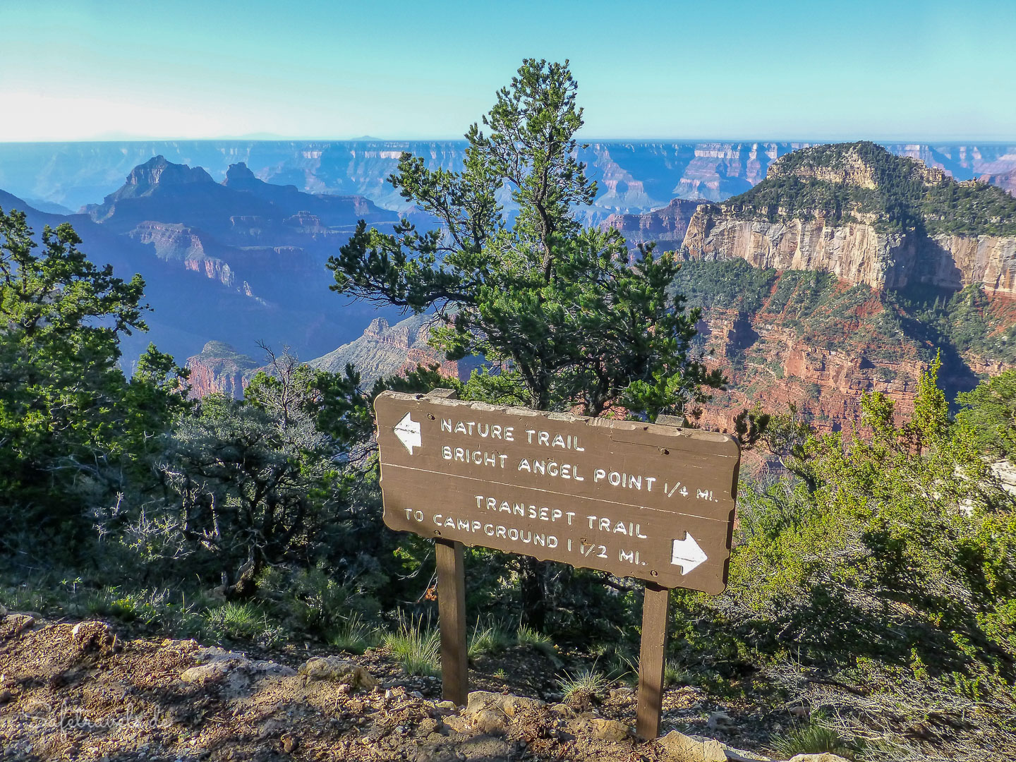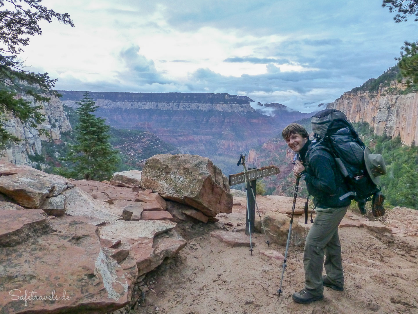 Um 6 Uhr nehmen wir das Shuttle an der Lodge zum North Kaibab Trailhead. Im Bus sind noch mehr Hiker unterwegs und die Stimmung ist gut. Es ist recht kühl heute Morgen und es regnet nicht mehr. Am Trailhead werden Starter-Fotos gemacht und um 6:10 Uhr setzten wir die Füße auf den Trail. Das Abenteuer beginnt.