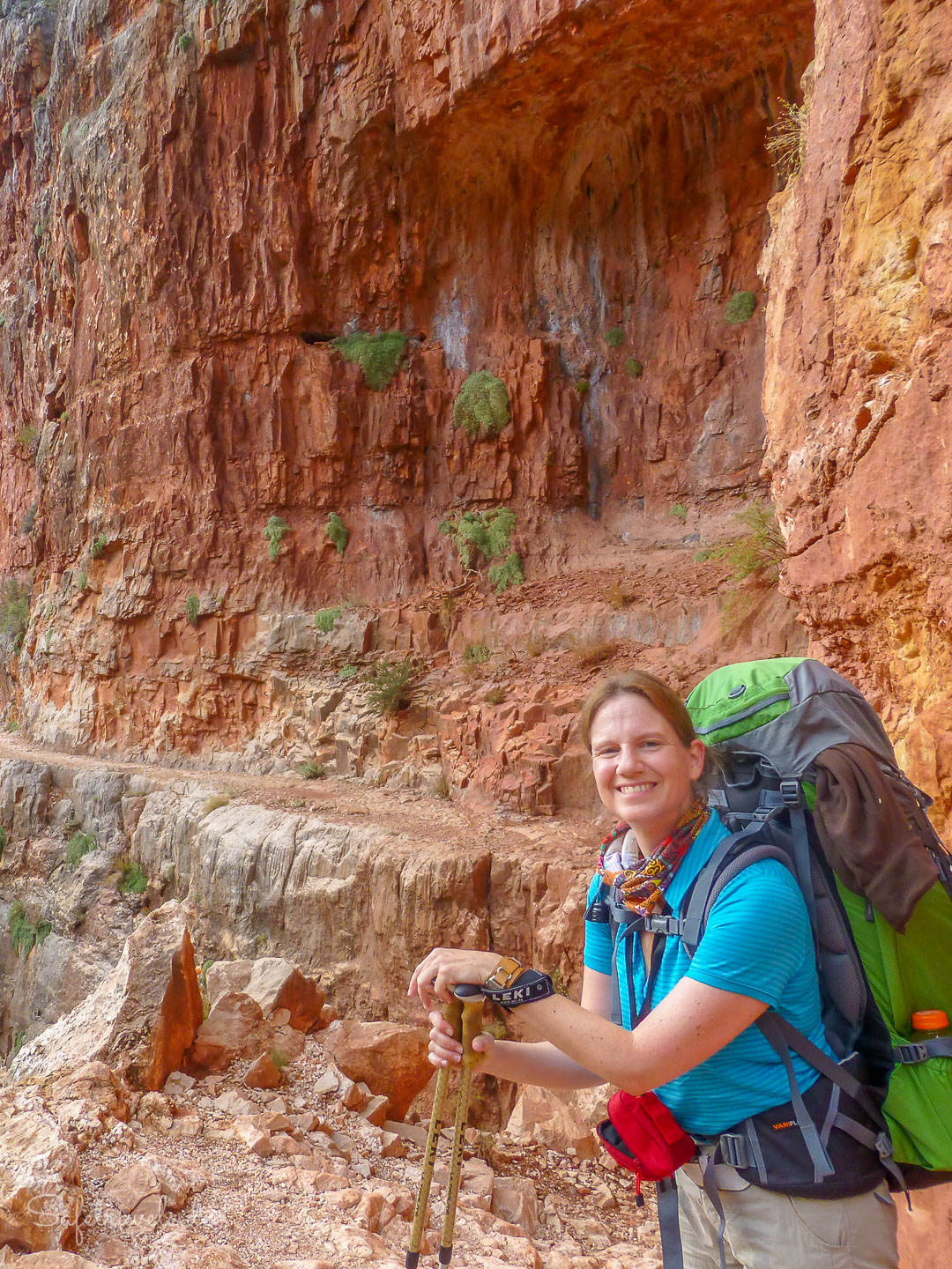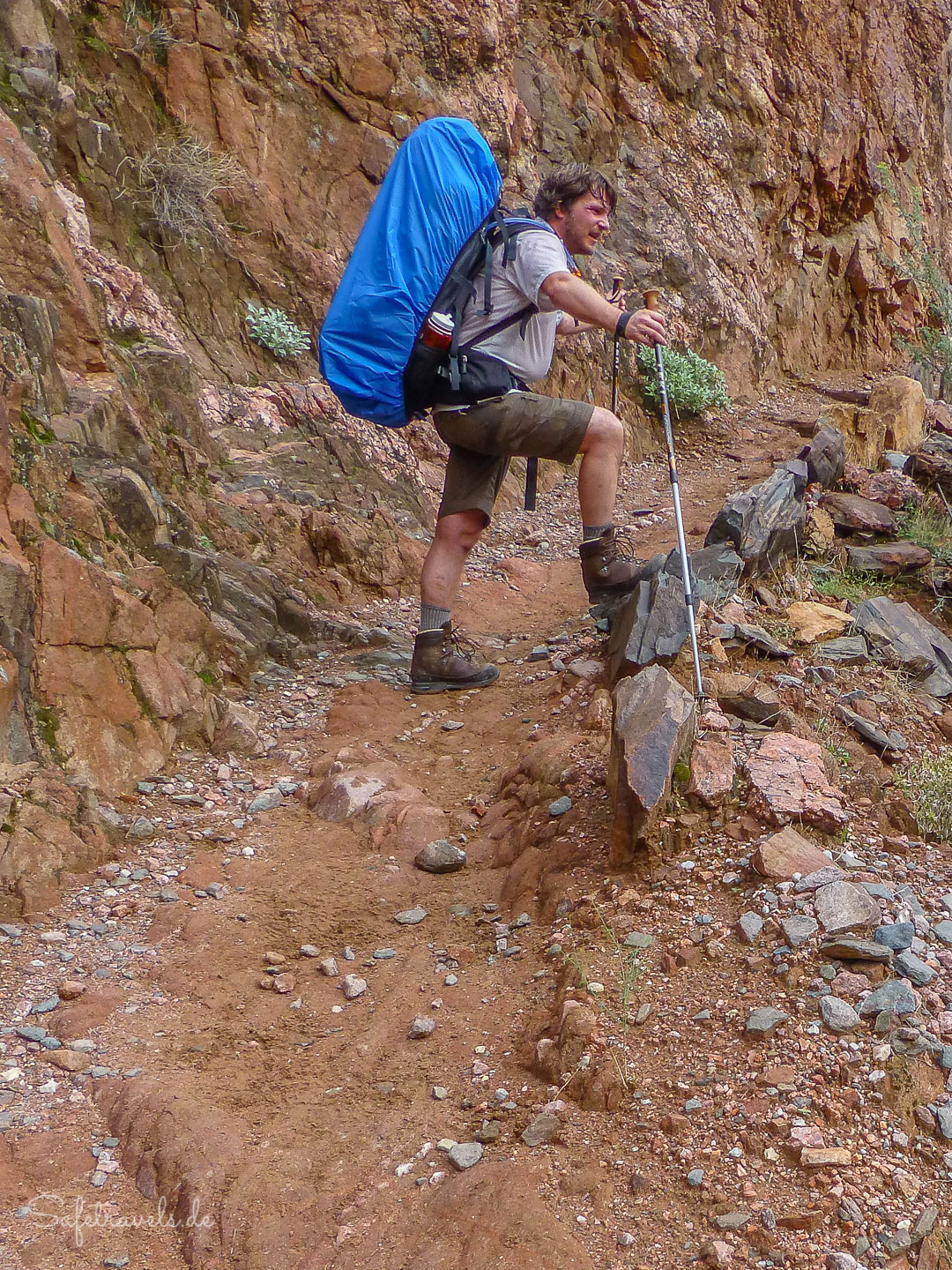 Inzwischen sind mehr Leute unterwegs und viele Hiker beglückwünschen uns zur fast vollbrachten Durchquerung des Canyons. Genau das haben wir vor drei Jahren auch gemacht, wenn wir erfolgreiche Hiker mit schwerem Gepäck getroffen haben. Viele treten nett zur Seite und lassen uns passieren.