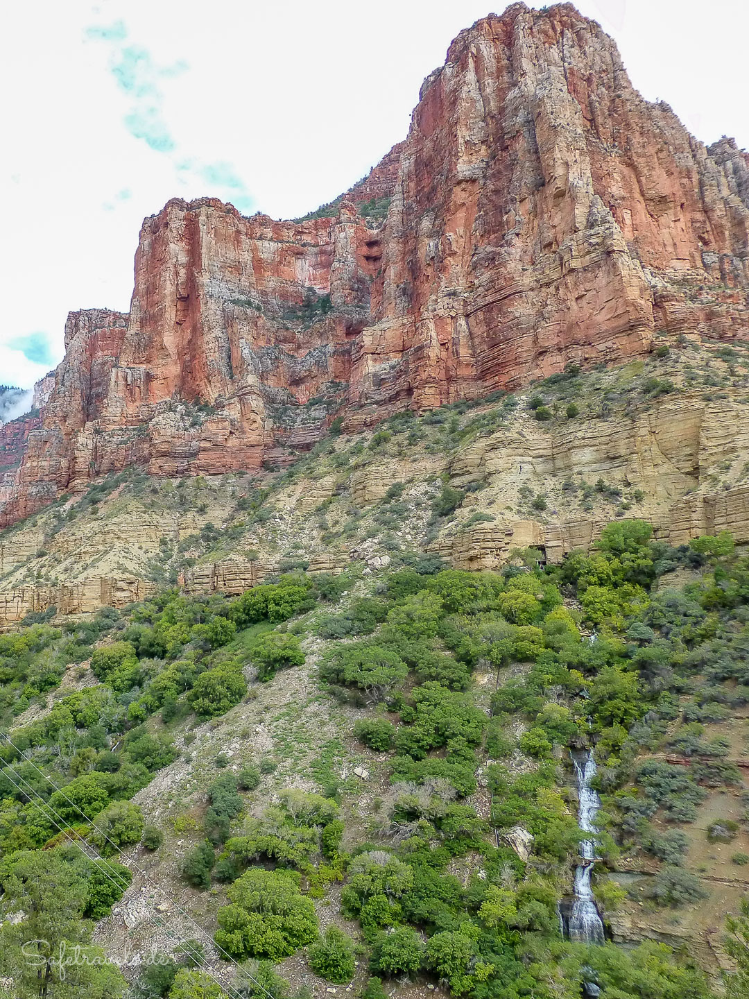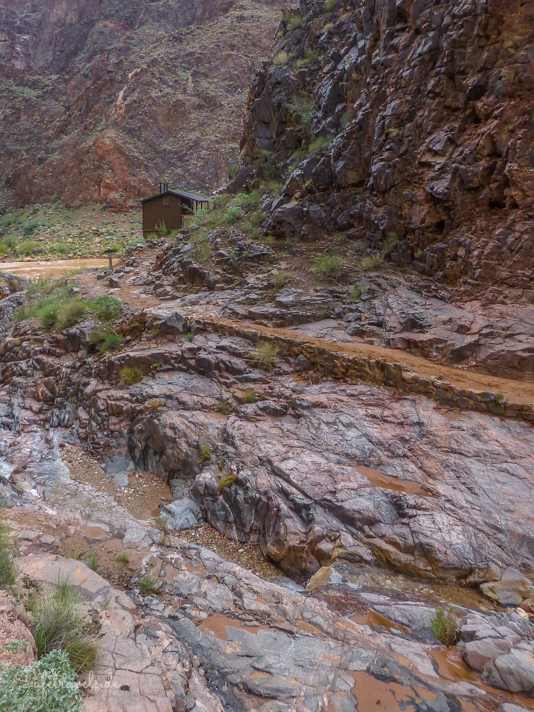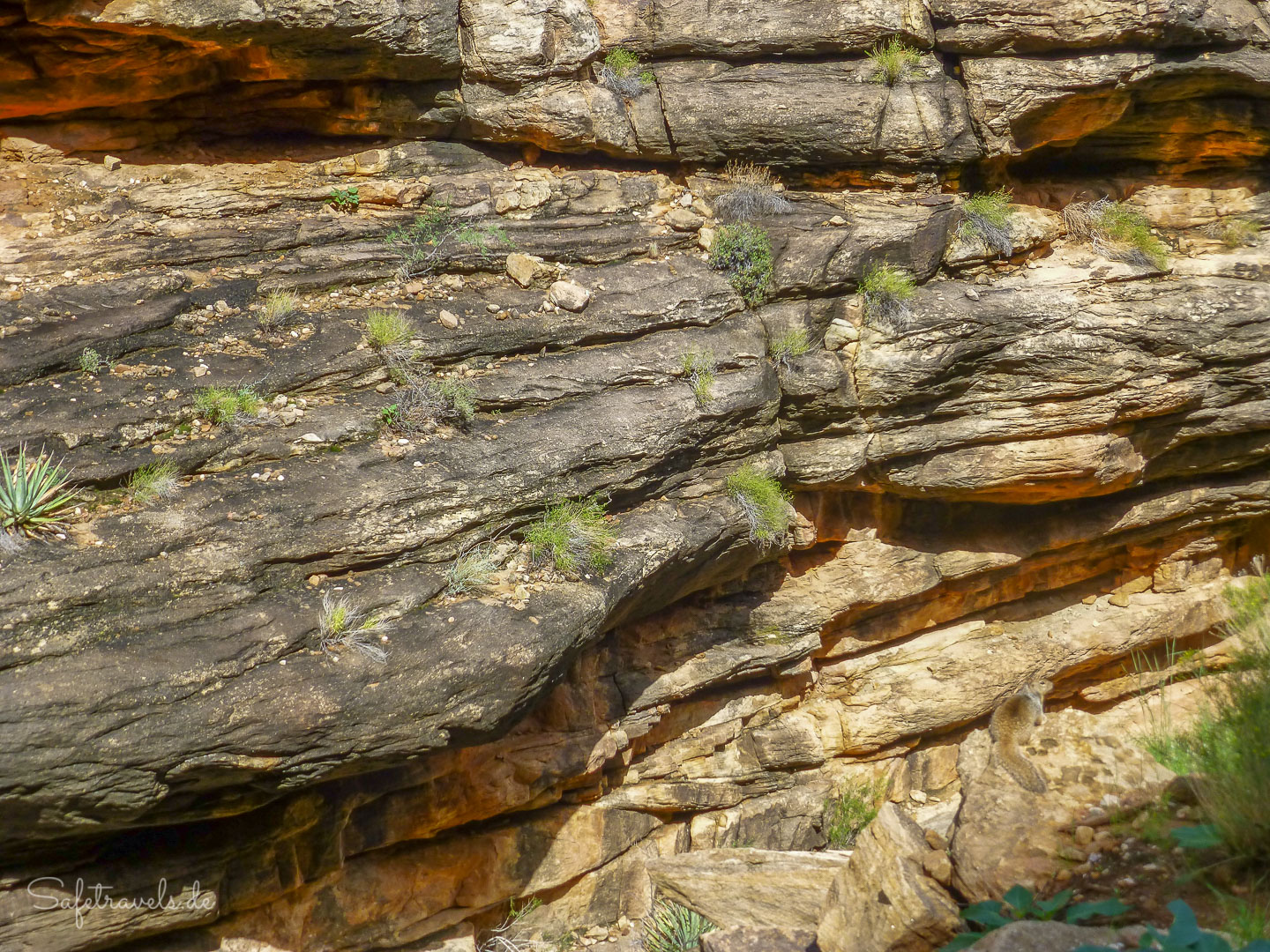 Hinter der Brücke beginnt ein besonders spektakulärer Teil des Trails, denn hier wurde er direkt aus der Felswand herausgesprengt und hat dadurch teilweise einen fast tunnelartigen Charakter. Bald kündigt ein leichtes Donnern an, dass wir schon nah an Roaring Springs sind. Roaring Springs versorgt den Inner Canyon und beide Rims mit Wasser. Es wird durch eine Pipeline hinauf gepumpt. Den Abstecher direkt zur Quelle lassen wir aus.