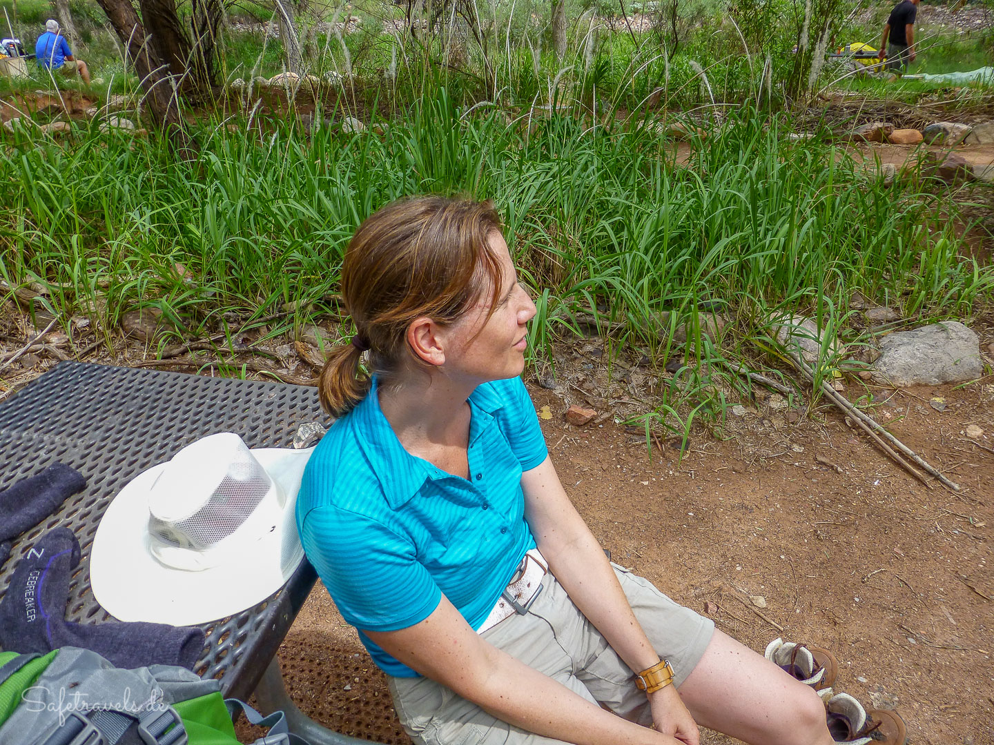 Nach 4 1/2 Stunden erreichen wir den idyllisch gelegenen Cottonwood Campground. Noch nicht viele Plätze sind belegt und wir suchen uns die gemütliche Campsite Nr. 5 aus und schlagen das Zelt auf. Um 12 Uhr fängt es dann an zu regnen. Als es gegen 14 Uhr noch mal trocken ist, kochen wir uns eine Mahlzeit. Unsere erstes gefriergetrocknetes Essen. Lecker! Auf dem Campground treffen wir Mary, die mit ihrem Mann Rod, Sohn Kyle und Bruder Jim den Rim to Rim Hike macht. Mary hat ziemlich kaputte Zehen, anscheinend sind ihre Schuhe etwas zu klein. Wir helfen ihr mit unserem Erste-Hilfe-Kit aus und kommen ins Gespräch.