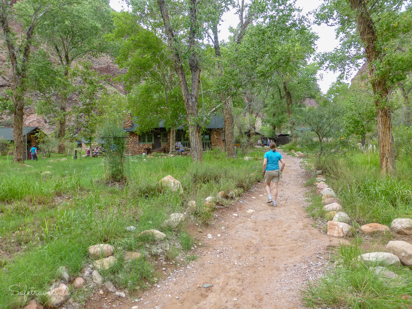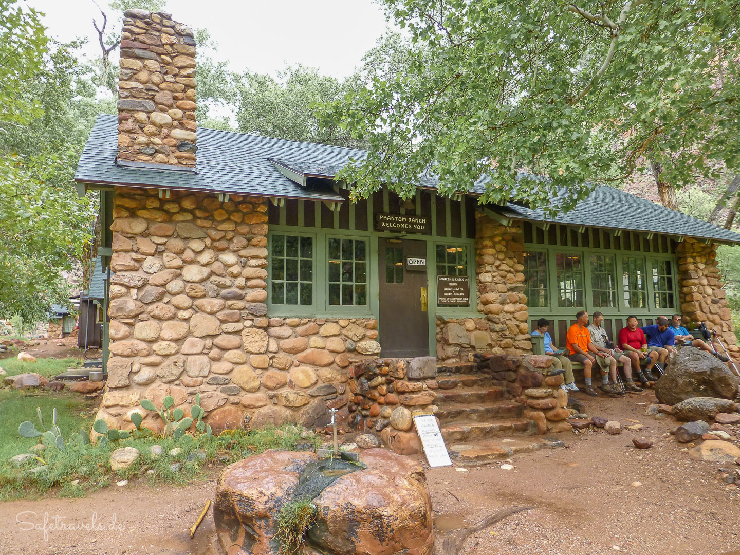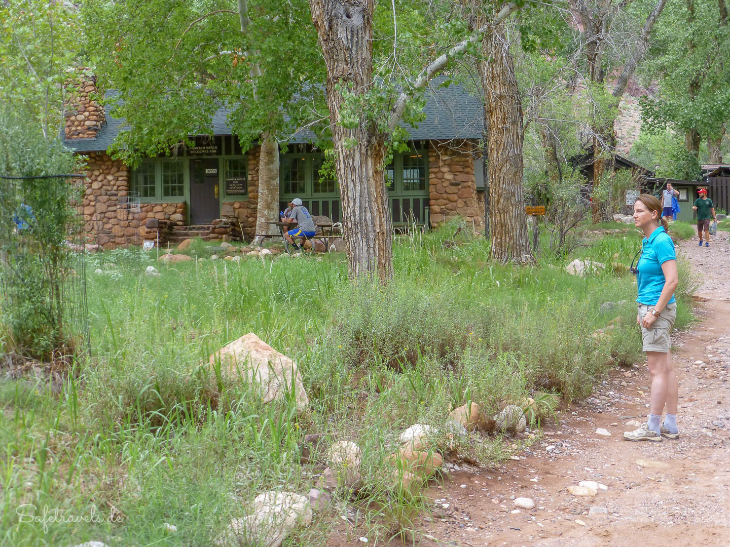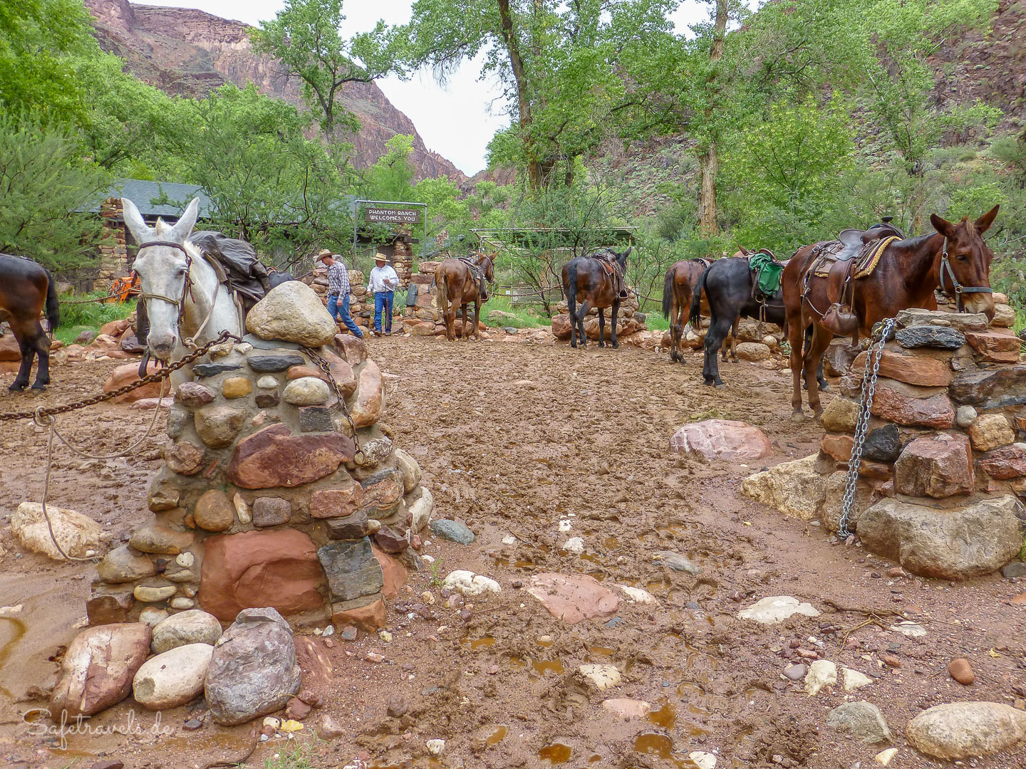 Wir machen uns auf den Weg zur Canteen der Phantom Ranch. Dort kaufen wir uns das T-Shirt, welches es nur hier unten gibt, und machen es uns mit einem Becher Kaffee gemütlich. Wäre es heißer gewesen, hätten wir zur legendären Limo gegriffen…aber so tut der Kaffee richtig gut. Wir schreiben Postkarten an unsere Eltern und unterhalten uns mit Mary und ihrer Familie, die wir gestern am Cottonwood Campground kennengelernt hatten, und anderen Hikern, die sich hier die Zeit vertreiben.