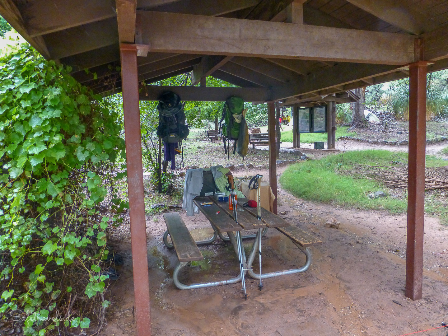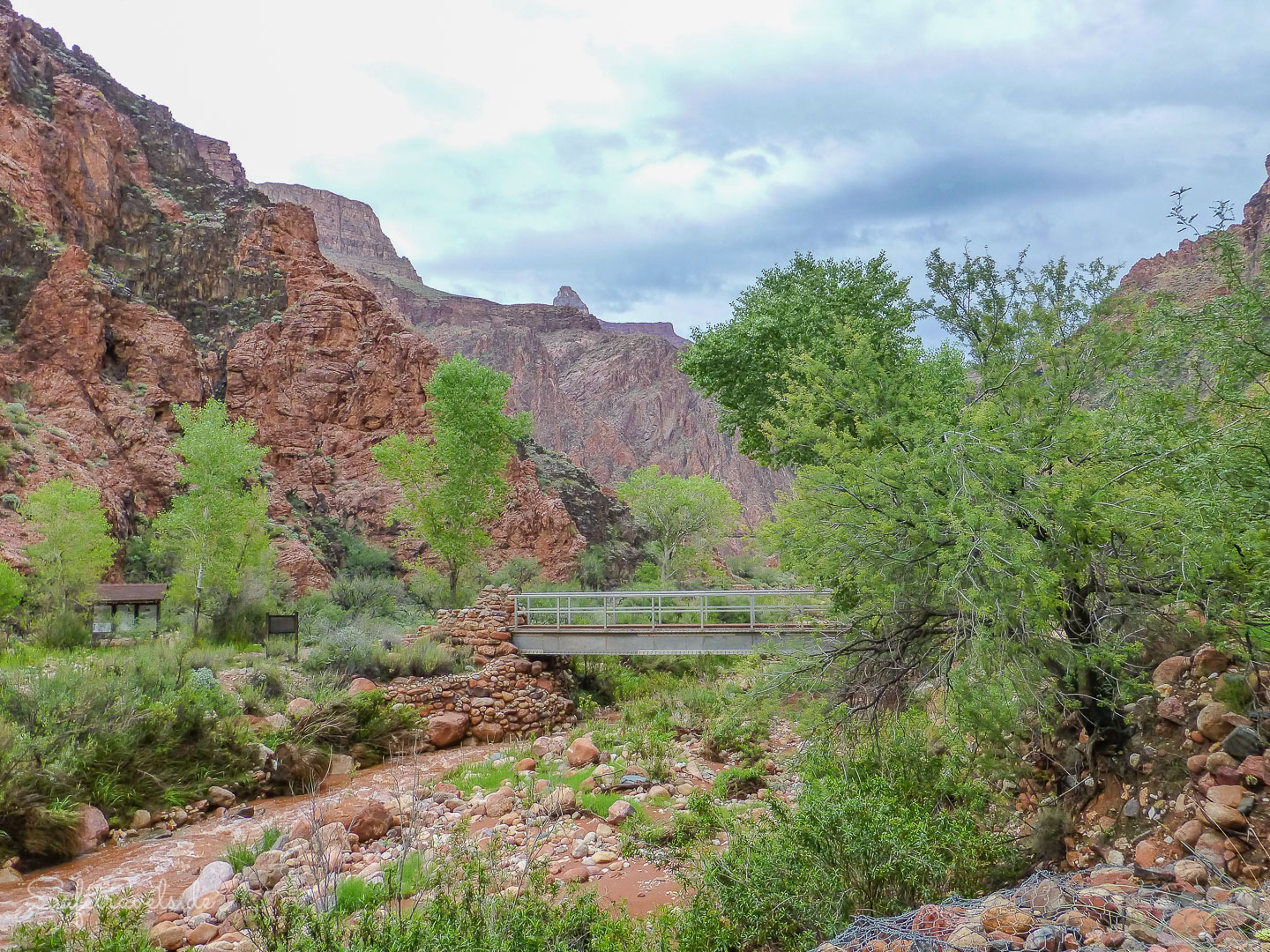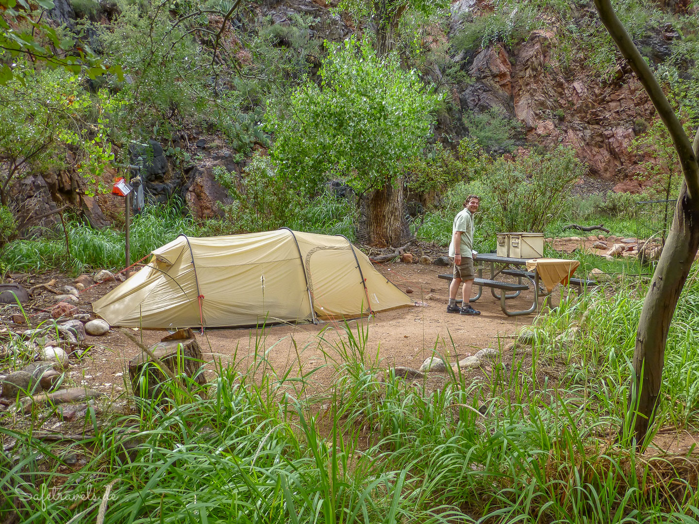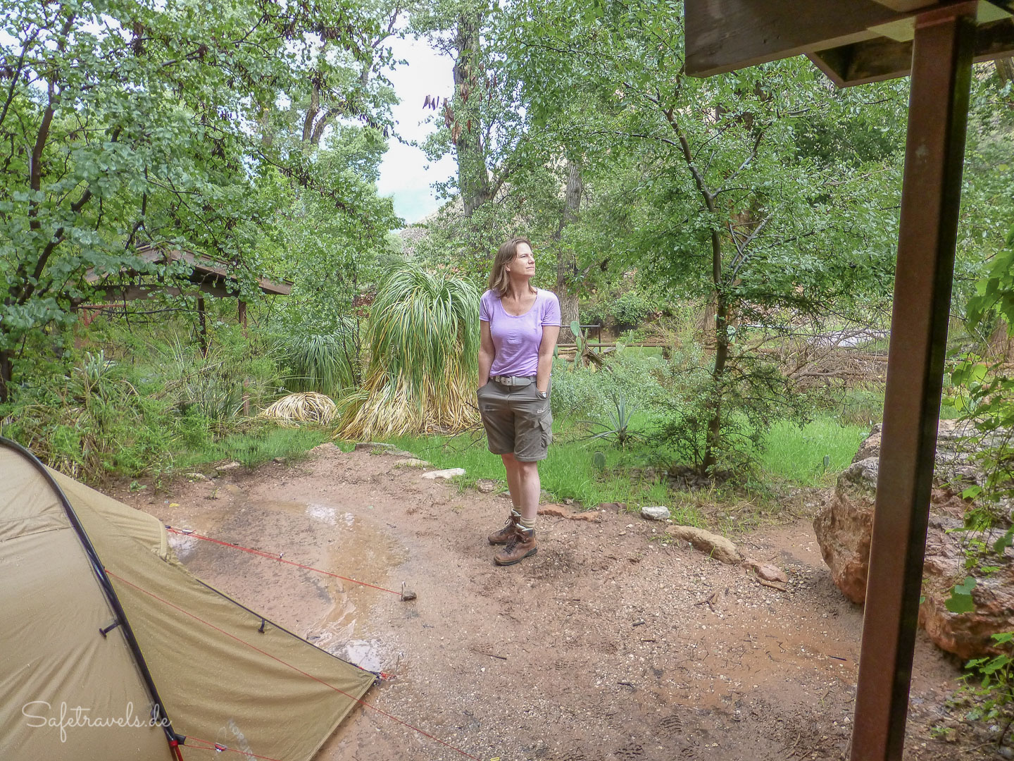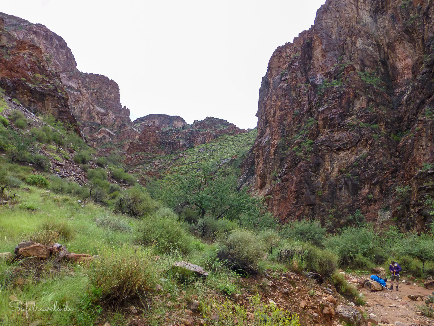Wir überqueren mehrmals über Brücken den Creek und erreichen um 11:45 Uhr den Bright Angel Campground. Hier ist es wunderschön grün und es sind noch sehr viele Campsites frei, obwohl wir so spät ankommen. Es gibt hier unten sogar Toiletten mit Wasserspülung und fließend Wasser am Waschbecken. Wir entscheiden uns für Platz 17 und bauen sofort das Zelt auf. Heute hat es noch nicht geregnet und wir hoffen, dass das Zelt trocknen kann, bevor es wieder anfängt. Tatsächlich trocknet das Zelt sehr schnell.