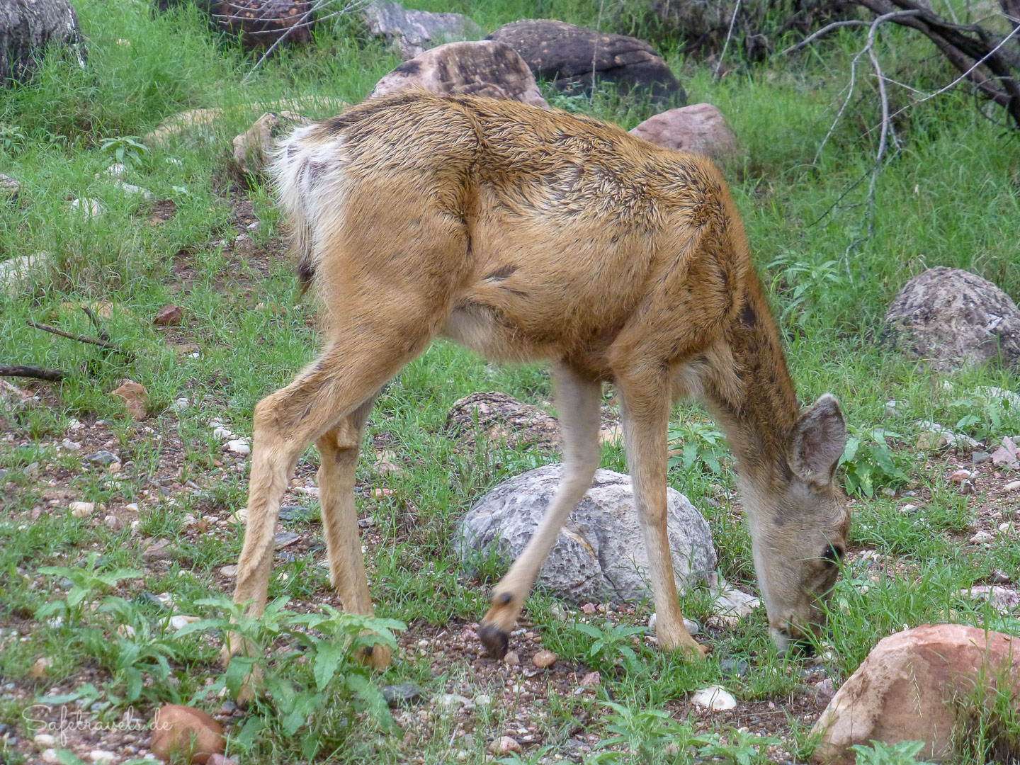 Gegen 15:30 Uhr brechen wir zu einem kleinen Rundgang auf, denn natürlich wollen wir den Colorado sehen und uns die Brücken anschauen. Der Fluss ist braun und voll beladen mit Sediment. Als wir die Silver Bridge erreichen, fängt es wieder an zu regnen. Da wir nicht völlig durchnässen wollen, stellen wir uns unter und beobachten ein Reh beim Grasen.