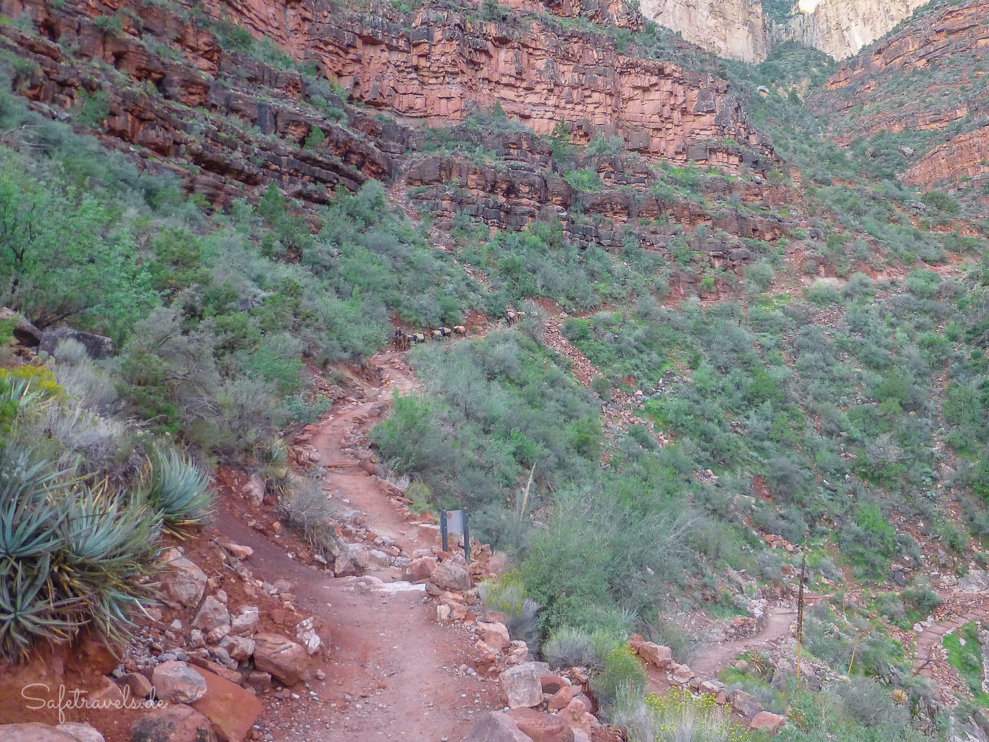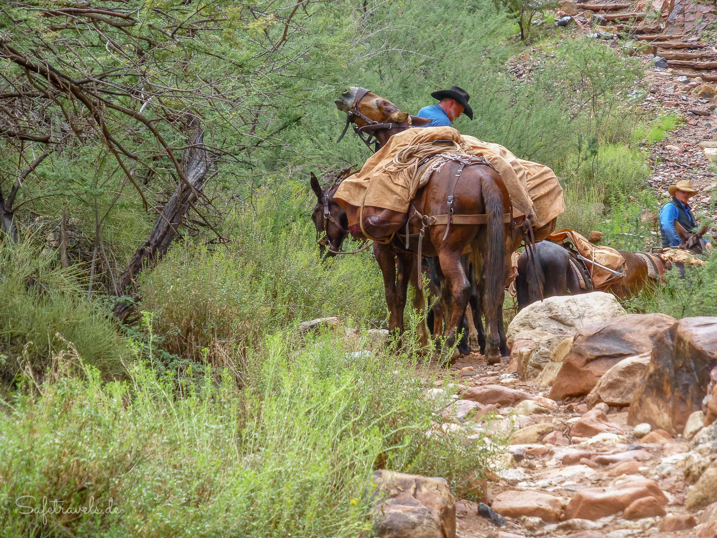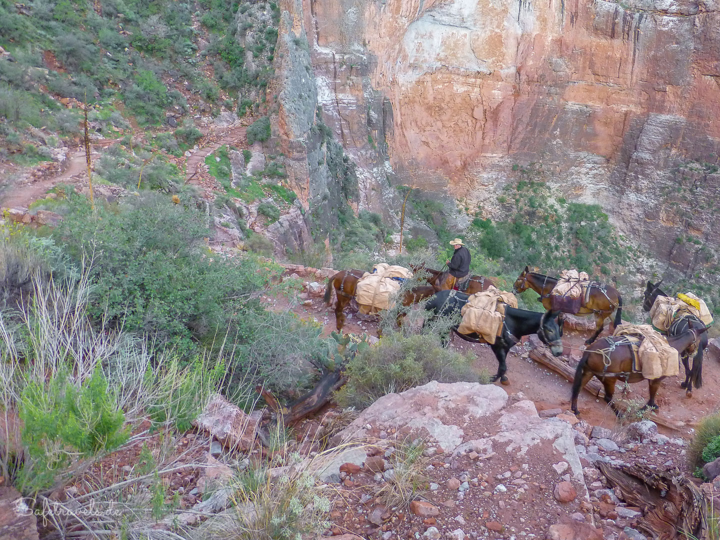 An der Mündungsstelle des Pipe Creek beginnt der Bright Angel Trail und hier beginnt auch der Aufstieg zum South Rim. Schon bald holt uns die erste Muli-Karawane ein und erklimmt vor uns Devils Corkscrew, eine Reihe steiler und anstrengender Switchbacks.