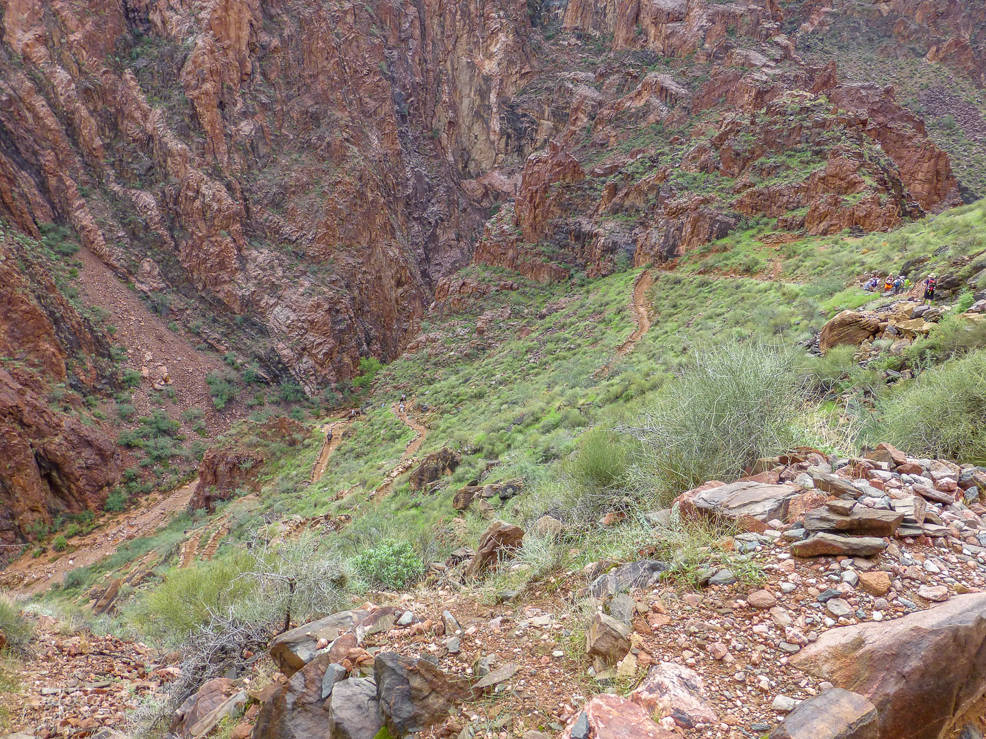 Nach dem 1,5-Mile-Resthouse bezwingen wir noch ein steiles Stück des Bright Angel Trail und dann kommen die letzten Switchbacks. Immer mehr Leute kommen uns entgegen und wir werden in zahlreiche kurze Gespräche verwickelt. Hier sind nun auch die vielen dummen Touristen mit Flip-Flops und ohne jeglichen Respekt vor der Natur oder anderen Menschen unterwegs. Für uns fühlt sich das nach diesen Tagen im Canyon fast wie ein Kulturschock an.