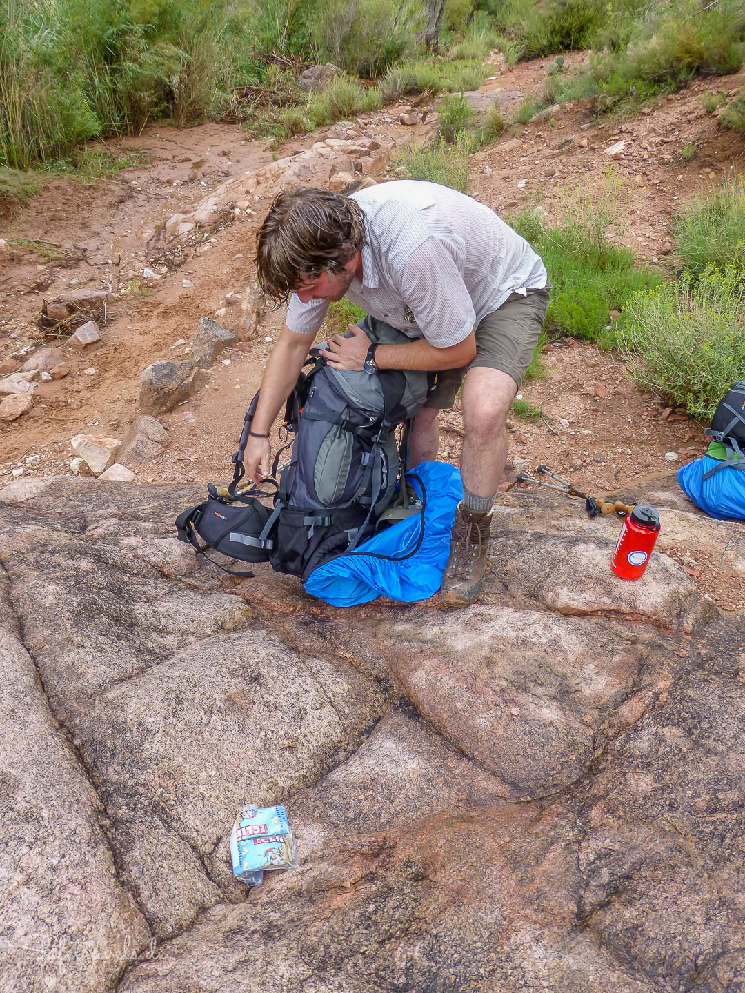 Auf dem Bright Angel Campground ist bereits um 5 Uhr die Nacht für uns vorbei. Es hat wieder geregnet und dementsprechend nass sind das Zelt und die Unterlage. Nach einem kurzen Frühstück mit Riegeln bzw. Trailmix sind wir um 7 Uhr startbereit.