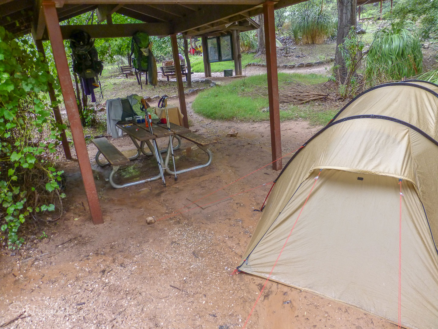 Bereits um 19:15 Uhr ist es dunkel und wir verkriechen uns ins Zelt. Es regnet die ganze Nacht. Zum Glück ist unser Zelt groß genug, so daß unsere Rucksäcke mit rein können und wir trotzdem noch reichlich Platz haben.