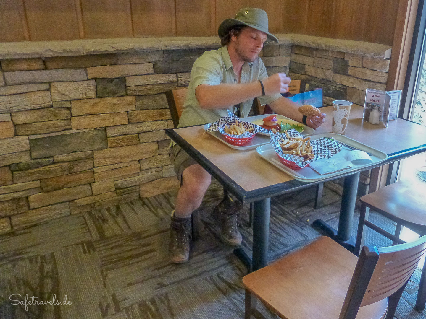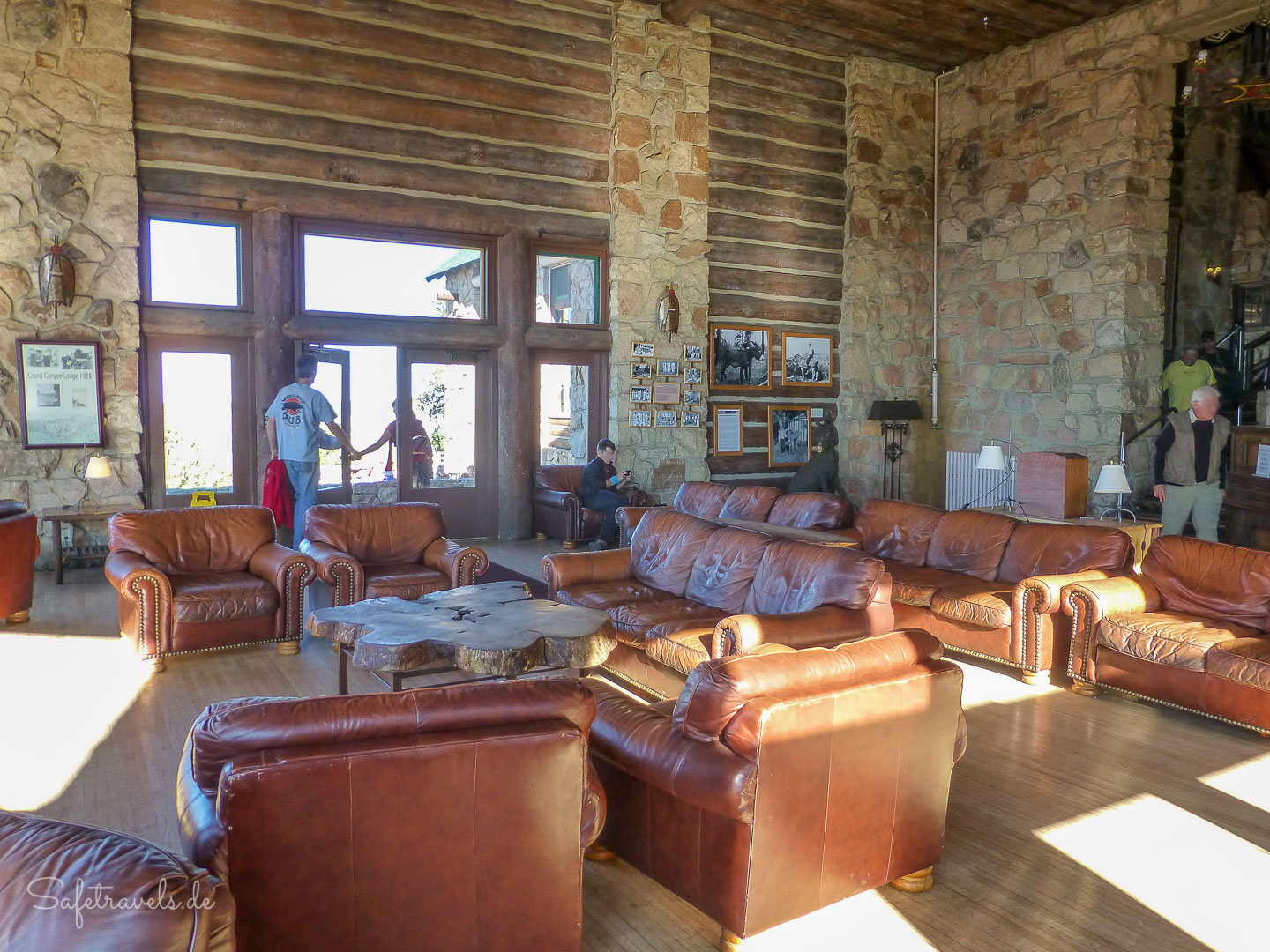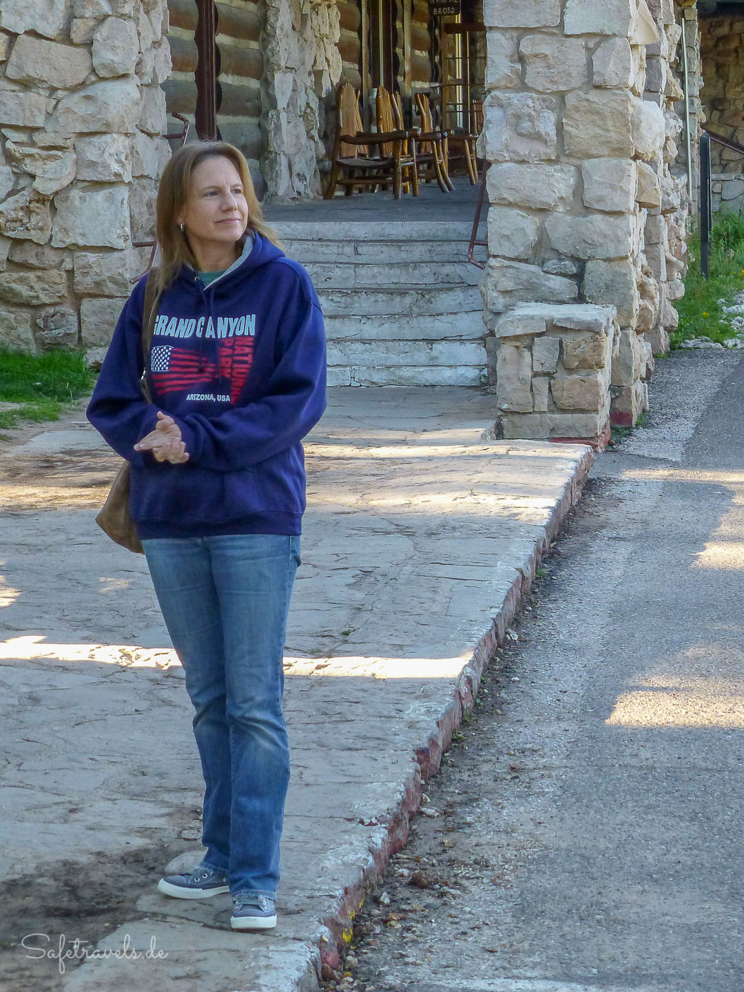 Bis 13:30 Uhr haben wir nun noch reichlich Zeit. Zum Glück können wir unsere Rucksäcke in der Bright Angel Lodge deponieren und haben damit noch richtig Zeit zum Genießen. Wir stürmen den Souvenir-Shop und kaufen uns das wohlverdiente Rim to Rim T-Shirt. Anschließend gehen wir rüber in die Cantina der Maswik Lodge und belohnen uns mit einem leckeren Burger. Als wir zur Bright Angel Lodge zurückkommen, treffen wir Mary und ihre Familie. Auch sie sind inzwischen am Rim angekommen.
