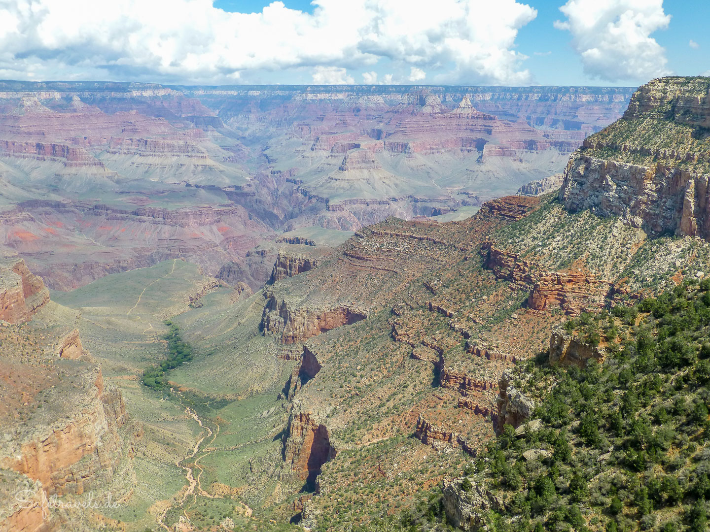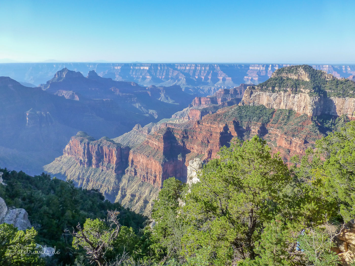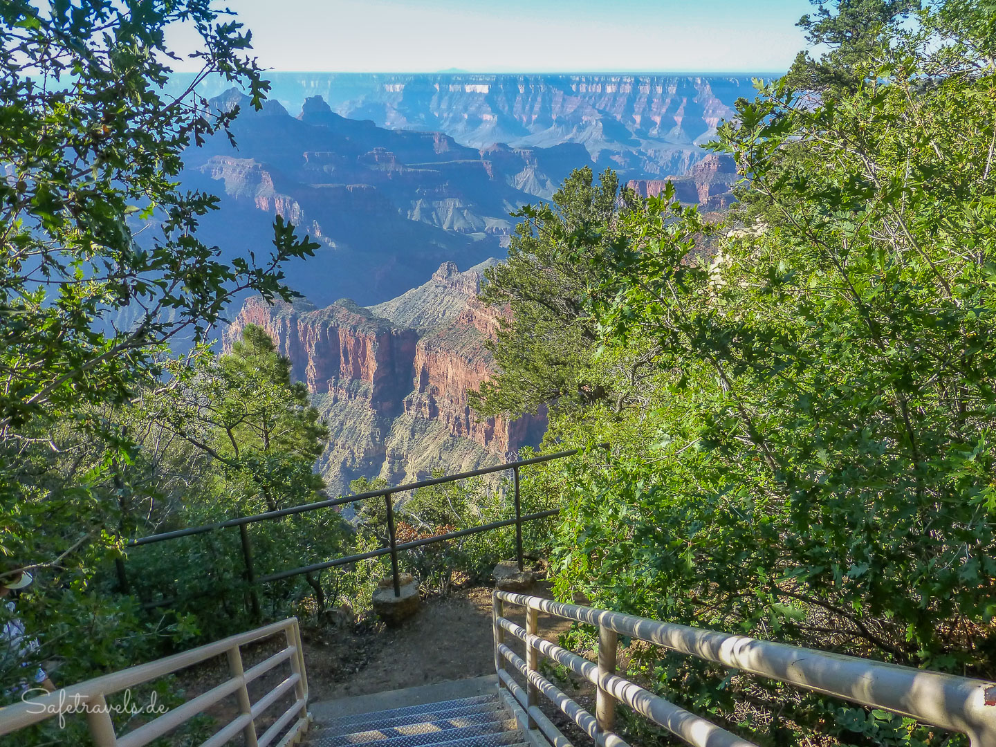 Zu Beginn windet sich der North Kaibab Trail durch die Wälder des North Rim. Schon bald erreichen wir mit dem Coconino Overlook eine erste Stelle mit wunderschöner Aussicht in den Roaring Springs Canyon, durch den wir Richtung Bright Angel Canyon laufen. Weiter hinab geht es über Switchbacks und der nächste Stopp ist am Supai Tunnel. Hier gibt es Wasser und Pit Toilets, somit ist hier ein idealer Platz für eine erste entspannte Pause mit Snacks.
