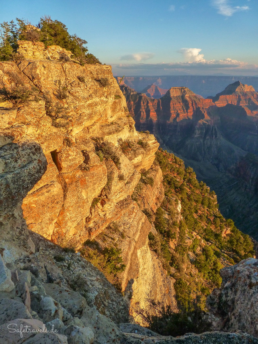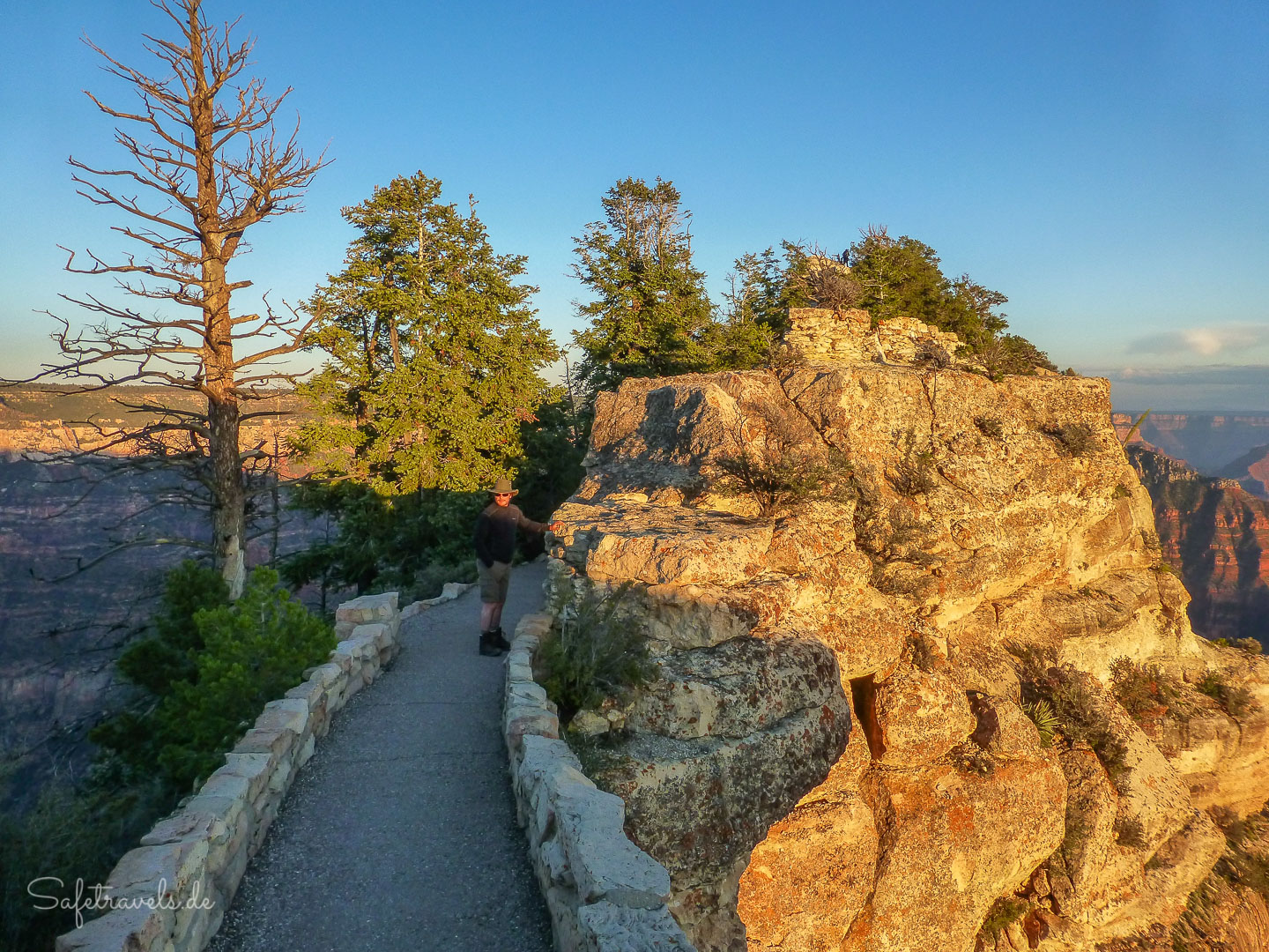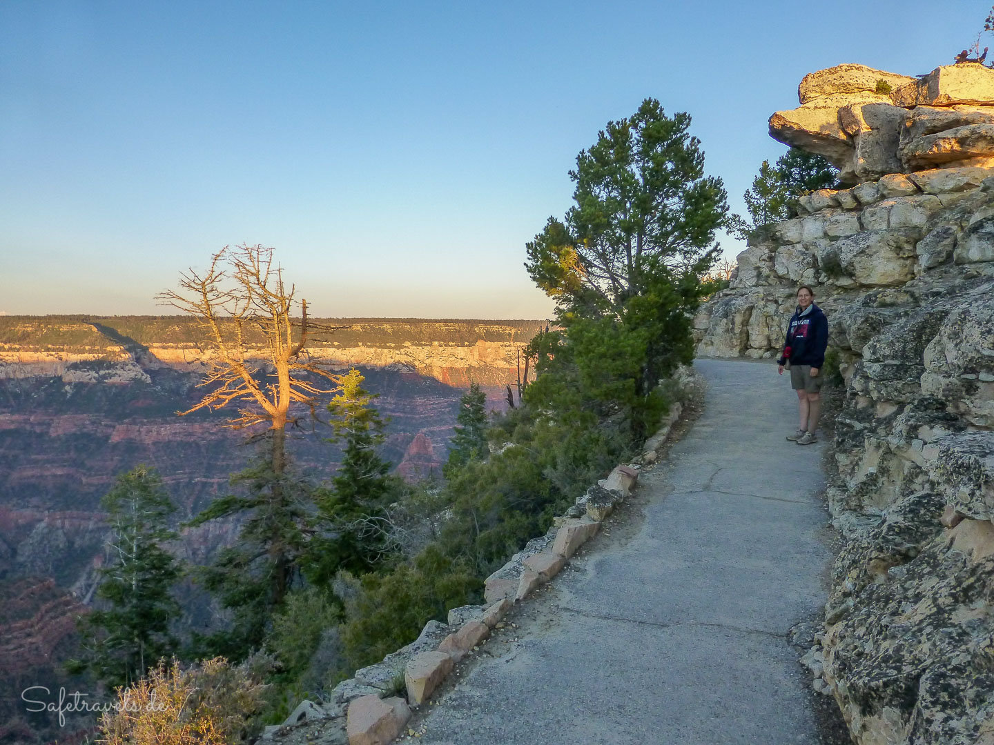 Um 17:30 Uhr erreichen wir die North Rim Lodge. Unser Auto samt Gepäck ist noch dort, wo wir es verlassen haben. Wir checken in der Lodge ein und schauen uns den Sonnenuntergang am Bright Angel Point an.