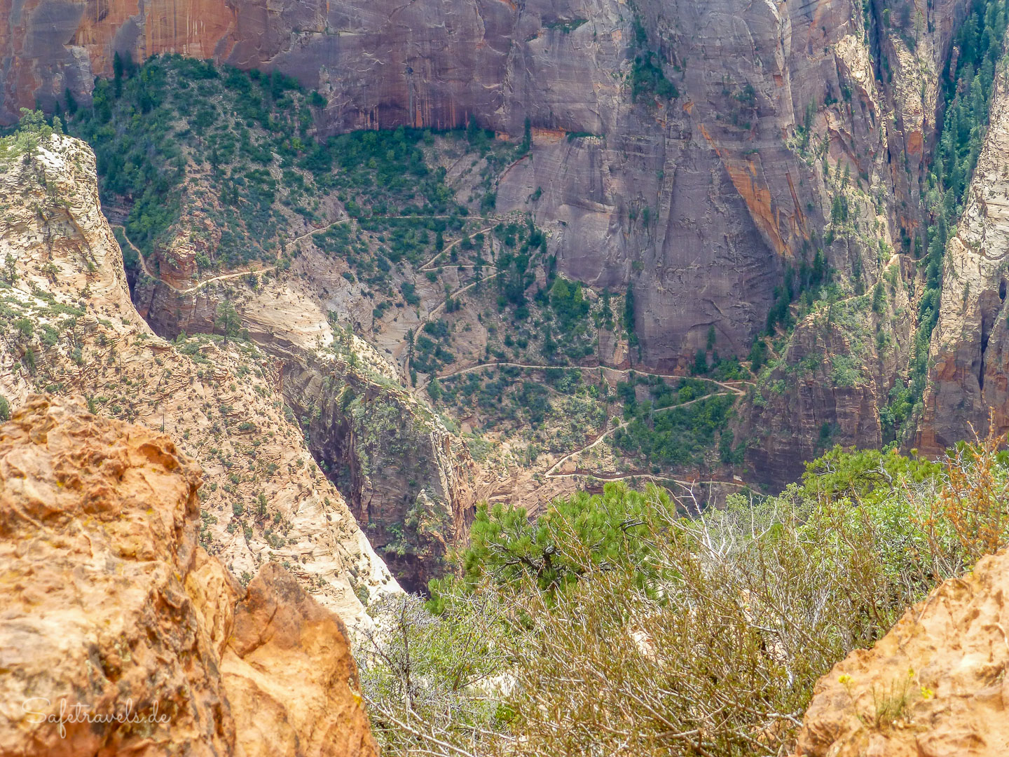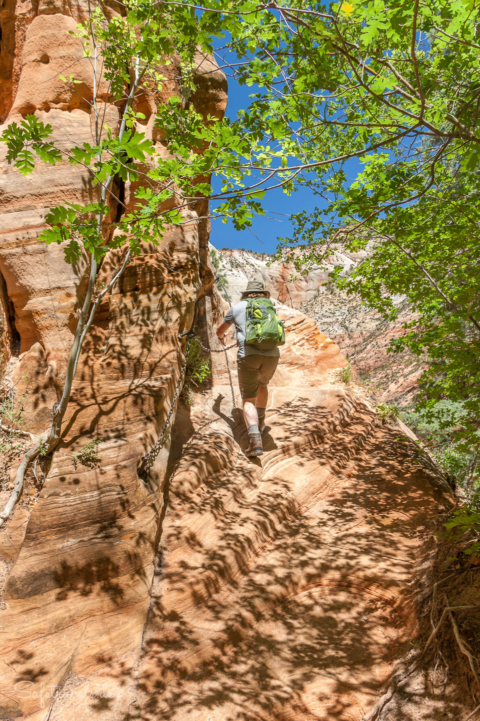 Der Trail ist anfangs derselbe wie zum Observation Point. Er windet sich zunächst in asphaltierten Serpentinen die Wand hinauf. Bald ist der Abzweig zum Hidden Canyon erreicht und die Switchbacks werden enger und steiler. Der Aufstieg ist nicht unanstrengend, dafür bieten sich wunderschöne Aussichten auf den Canyon und auf Angels Landing auf der gegenüberliegenden Seite.