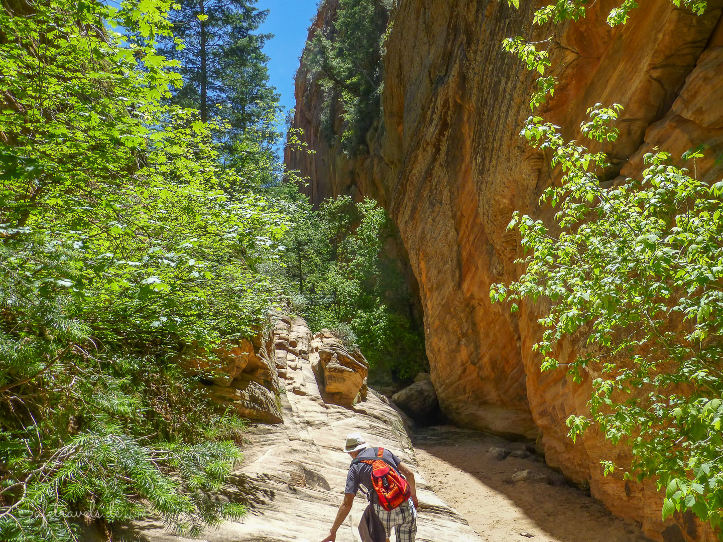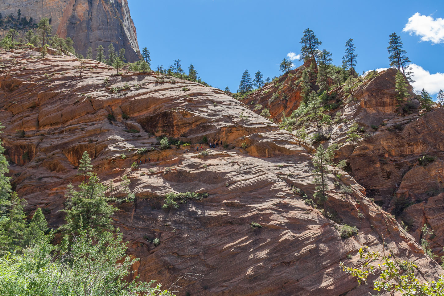 Der Trail ist anfangs derselbe wie zum Observation Point. Er windet sich zunächst in asphaltierten Serpentinen die Wand hinauf. Bald ist der Abzweig zum Hidden Canyon erreicht und die Switchbacks werden enger und steiler. Der Aufstieg ist nicht unanstrengend, dafür bieten sich wunderschöne Aussichten auf den Canyon und auf Angels Landing auf der gegenüberliegenden Seite.