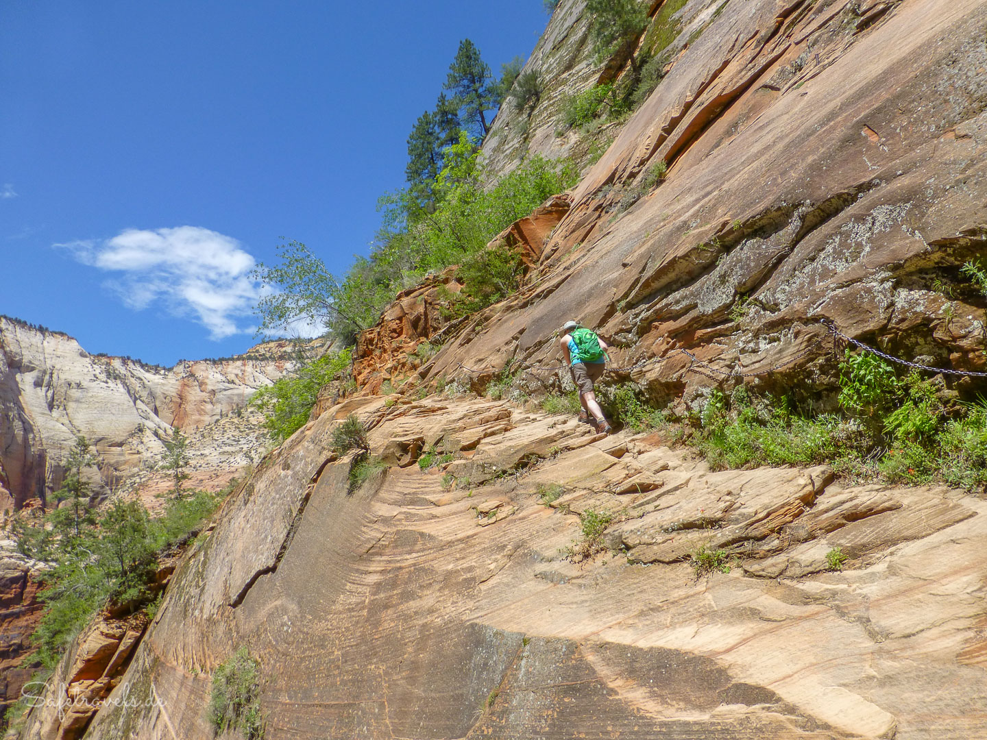 Schließlich erreichen wir die spannendste Stelle. Hier wurde der Trail aus der blanken Felswand geschlagen und führt über einen exponierten Vorsprung. Teilweise gibt es Ketten zur Sicherung. Trotz Höhenangst überwinde ich mich und wir gehen den Rest des Trails bis zum Anfang des Hidden Canyon.