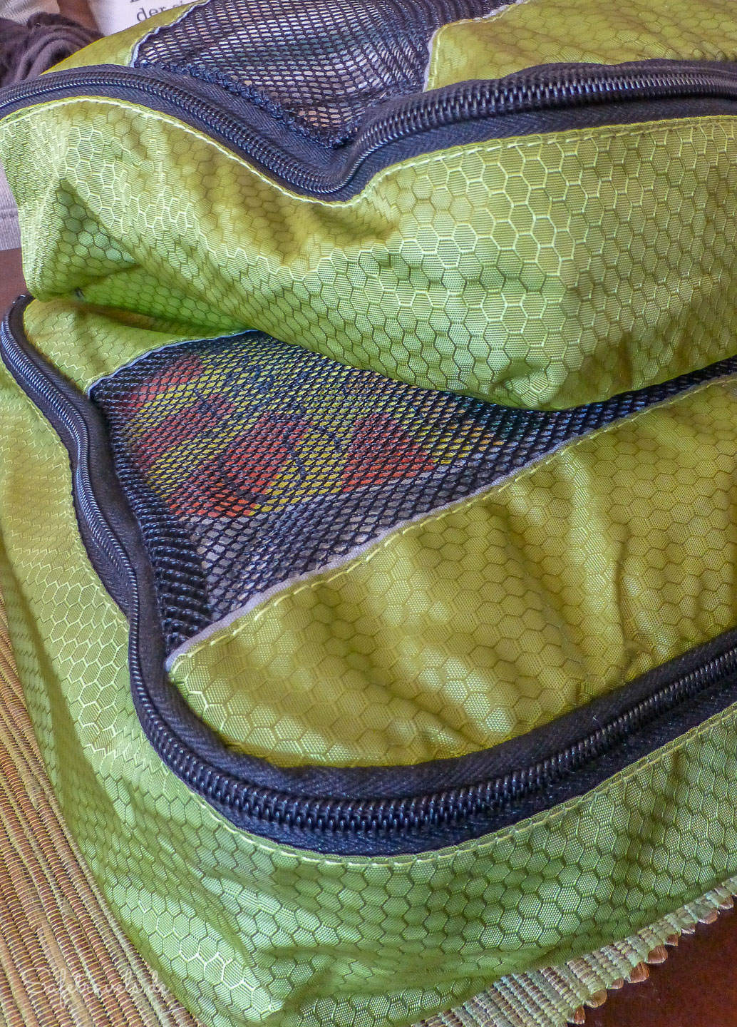 Jeder von uns hat zwei Sets von Packwürfeln, meine sind grün und die von Markus sind orange. Die Packwürfel von Eagle Creek* sind besonders robust uns sehr leicht und damit hervorragend für´s Trekken geeignet, um Ordnung im Rucksack zu halten. Unser jeweils zweites Set von BagSmart* hat einen Mesh-Einsatz und ist perfekt für Hosen, Hoodies o.ä. etwas größere Kleidungsstücke.