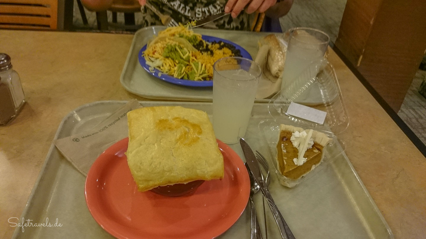 Die Cafeteria befindet sich im Hauptgebäude der Maswik Lodge im Grand Canyon Village. Übrigens ist diese Lodge unser Favorit als Übernachtungsmöglichkeit am Grand Canyon. In 5 Minuten bist Du zu Fuß direkt am Rim und am Bright Angel Trailhead. Der Besuch der Cafeteria gehört für uns immer mit dazu, besonders nach einem langen Hike genießen wir das super leckere Essen sehr. In der Cafeteria kannst Du Dich morgens, mittags und abends selbst bedienen. Von Pulled Pork über Tex-Mex bis zu Burgern gibt es hier für jeden Geschmack eine herzhafte Mahlzeit. Zum Frühstück gibt es vom Oatmeal und Obst bis zu Eiern mit Speck eine riesige Auswahl. Und wenn Dir diese Auswahl nicht reicht, dann gehst Du in den angeschlossenen Pizza Pub.