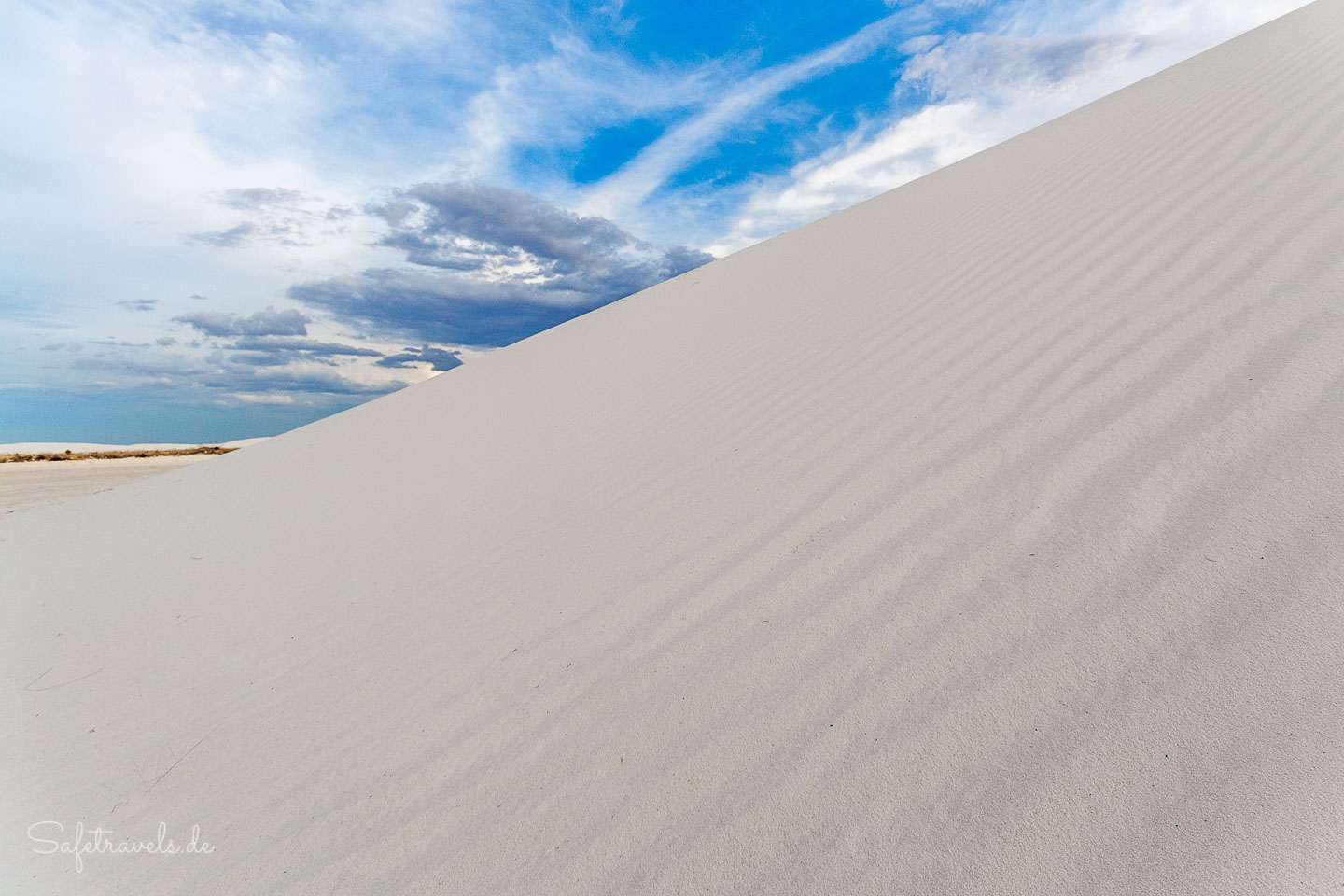 In und rund um Alamogordo fällt auf, dass sehr viel Militär unterwegs ist. Das liegt zum einen daran, dass das White Sands National Monument quasi auf dem Areal der White Sand Missile Range liegt, einem Raketen-Übungs- und Testgelände der US Army und zum anderen, das sich bei Alamogordo eine Air Force Base befindet. Auf der White Sands Missile Range wurde übrigens die erste Atombombe gezündet; auch unter dem Begriff „Manhatten Projekt“ bekannt. Auf der White Sands Missile Range werden nach wie vor Raketenübungen bzw. -test durchgeführt, was wir am nächsten Tag zu spüren bekommen sollten, aber dazu später mehr. Beim White Sands National Monument handelt es sich um ein Naturschutzgebiet, dass aufgrund der besonderen Geologie weltweit einzigartig ist. Die Dünen bestehen nämlich aus Gipssand – daher auch die wirklich schneeweiße Farbgebung. Nun, das allein ist noch nicht Besonderes. Allerdings gibt es nirgendwo auf der Erde ein vergleichbares Gebiet mit derartigen Gipssanddünen. Das Ganze hat etwas mit den besonderen geologischen Prozessen zu tun, die die Entstehung der White Sands ermöglichten.